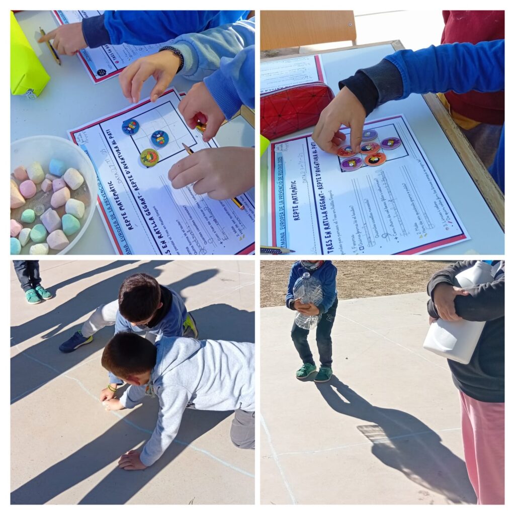 Durant la Setmana Europea de Prevenció de Residus, l’alumnat ha dissenyat un tres en ratlla gegant al pati de l’escola, mesurant i traçant el tauler amb cordes i passos per treballar la mesura, l’orientació espacial i la representació geomètrica en un entorn real.