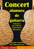 Dissabte 16 d’abril es va fer un concert de guitarres dirigit pels professors Darío Barrosso, Esteve Bosch i Alan Garcia. Aquí teniu les fotos.