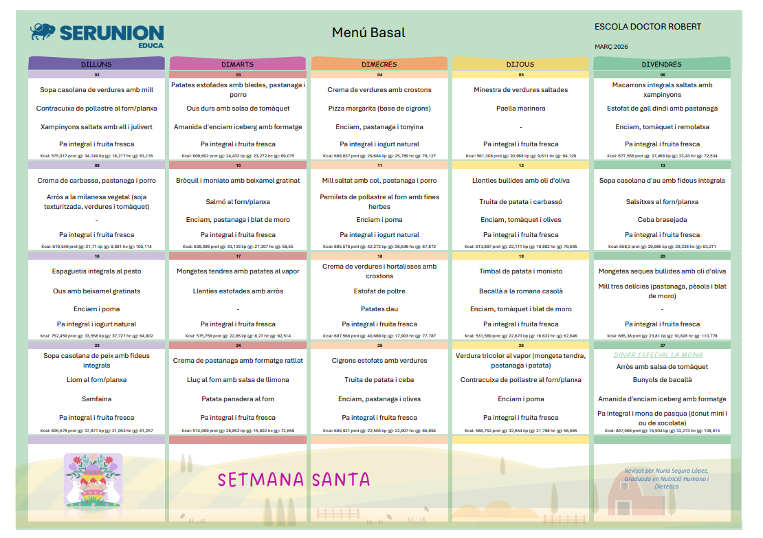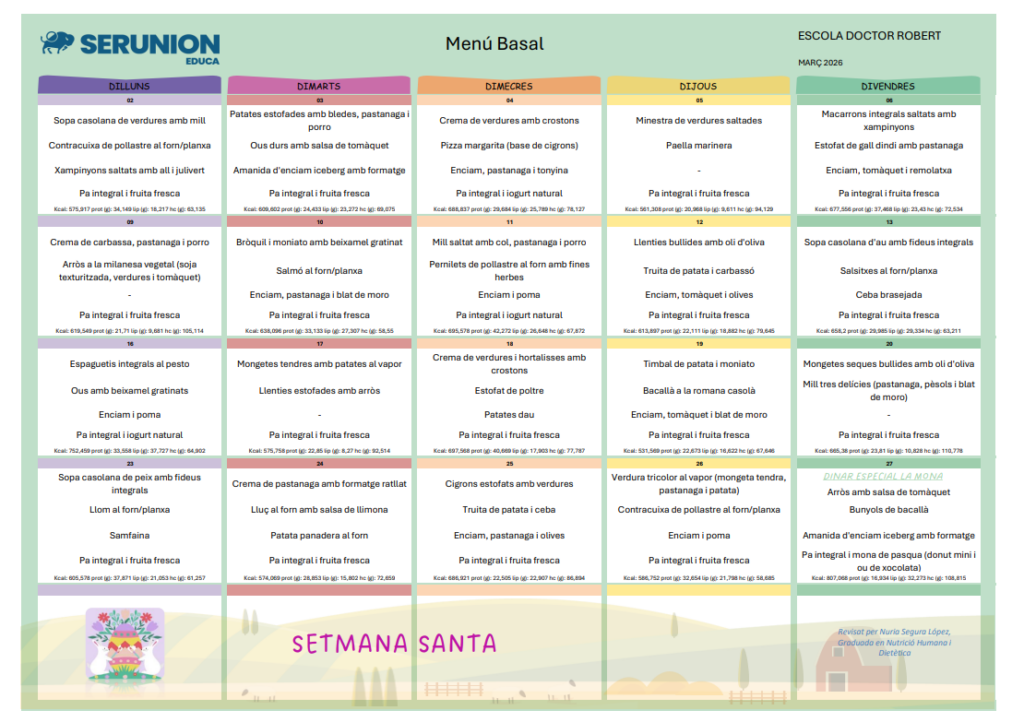 Menjador- Menús Menús Març (clicar el títol per veure’ls i descarregar-los) Servei gestionat pel Consell Comarcal del Ripollès. Horari del servei Educació infantil: 12:30h – 15h Educació primària: 13h – 15h Preu del servei Alumnat fixe: 5’85€/dia Alumnat esporàdic: 6’44€/dia
