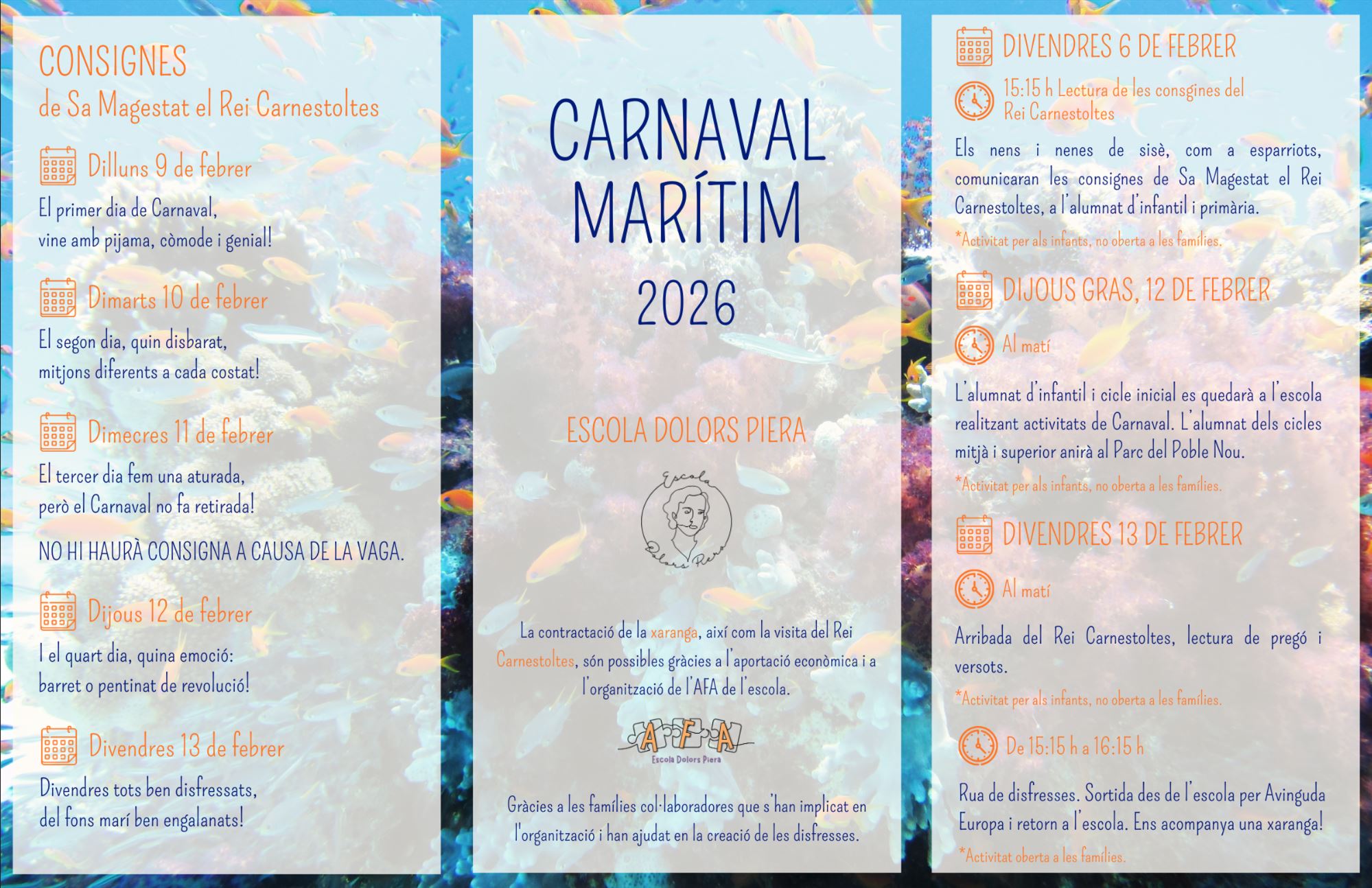 Aquest any, el tema del Carnaval és el fons marí, un món ple de colors, formes i vida. Ens endinsarem en oceans i mars per donar ales a la imaginació amb peixos, coralls i criatures marines.