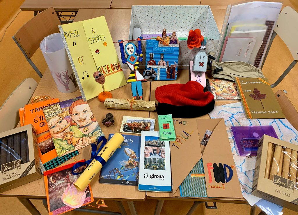 La nostra caixa ja és a l’escola Komenda d’Eslovènia i després de les vacances hem rebut la seva. Com podeu veure a la foto la caixa contenia molts objectes: capsetes de té, llaminadures, medalles, sabó, mel, mapes i postals, objectes de fusta, un saquet de sal, l’himne d’Eslovènia, la foto del seu equip de futbol