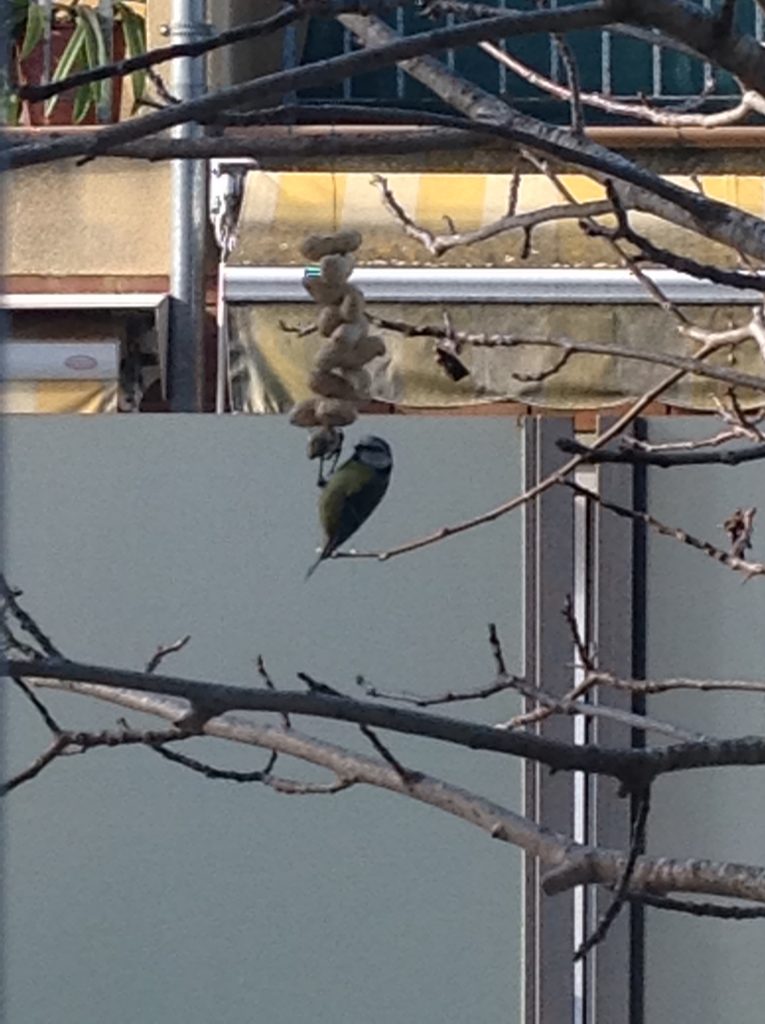 Els penjolls de cacauets que hem penjat les nenes i els nens de 2n als arbres de l’escola, estan tenint molt d’èxit. Avui ens ha visitat la mallerenga blava. La podeu veure menjant en aquestes fotos.