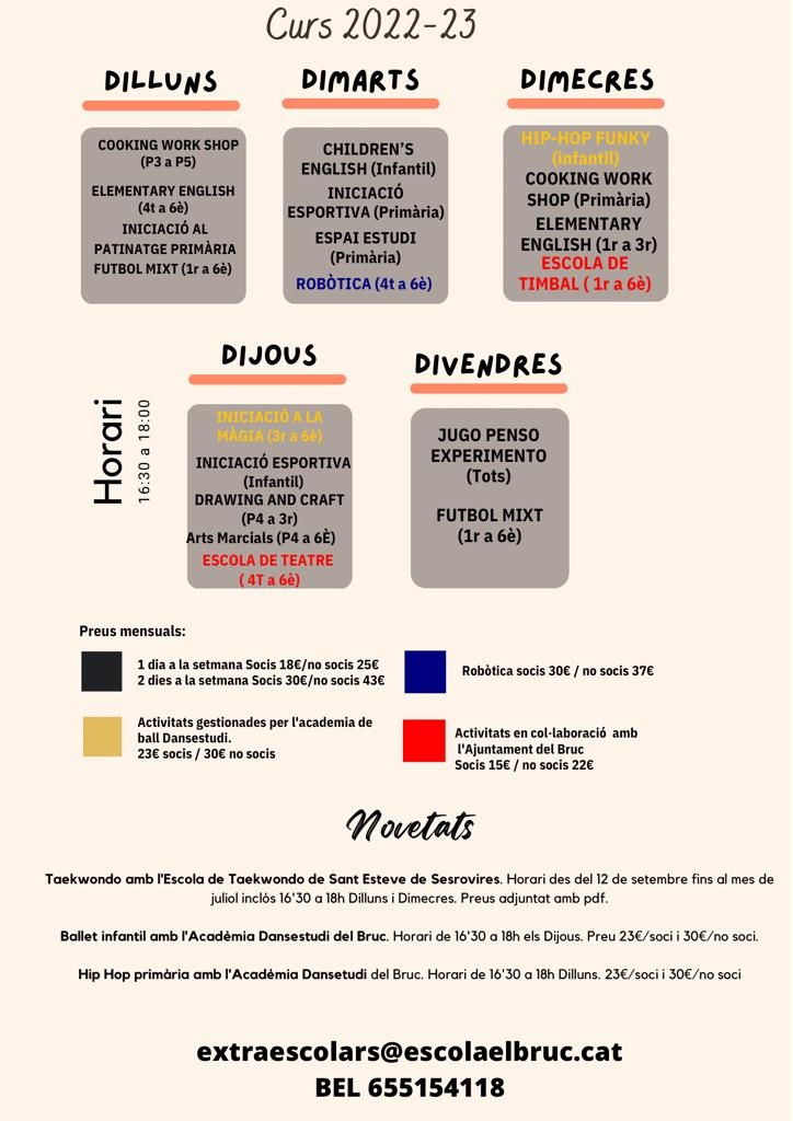 Per qualsevol cosa, no dubteu en contactar amb nosaltres a afa@escolaelbruc.cat o amb la Bel, la coordinadora de les extraescolars extraescolars@escolaelbruc.cat
