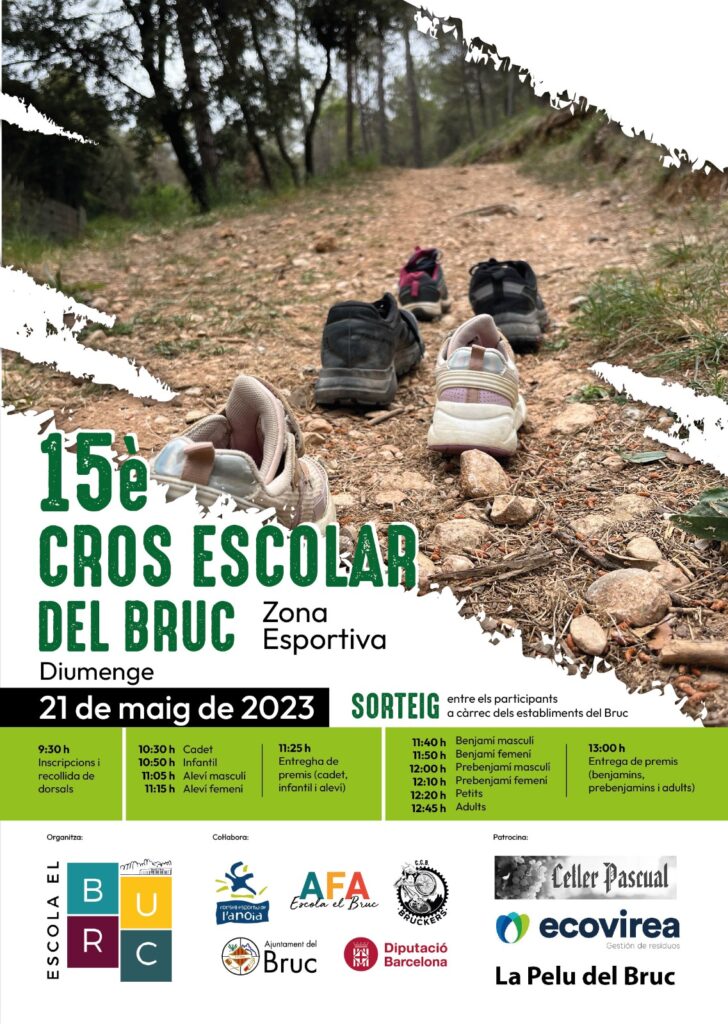 Cross escolar del Bruc dmanchen11/05/23 Diumenge 21 de maig tindrà lloc el cross escolar del Bruc. Us animem a participar i gaudir d’aquesta jornada esportiva.