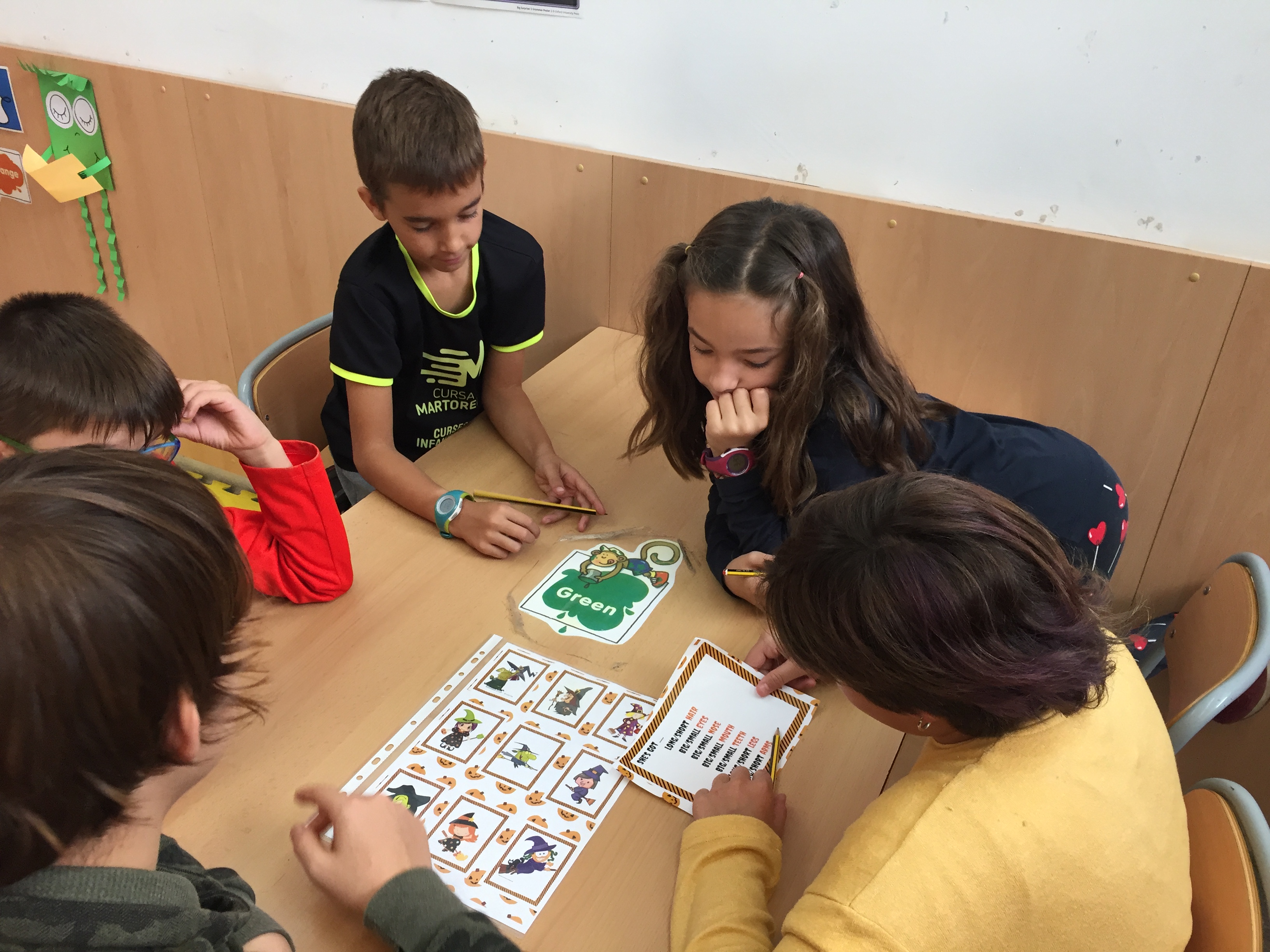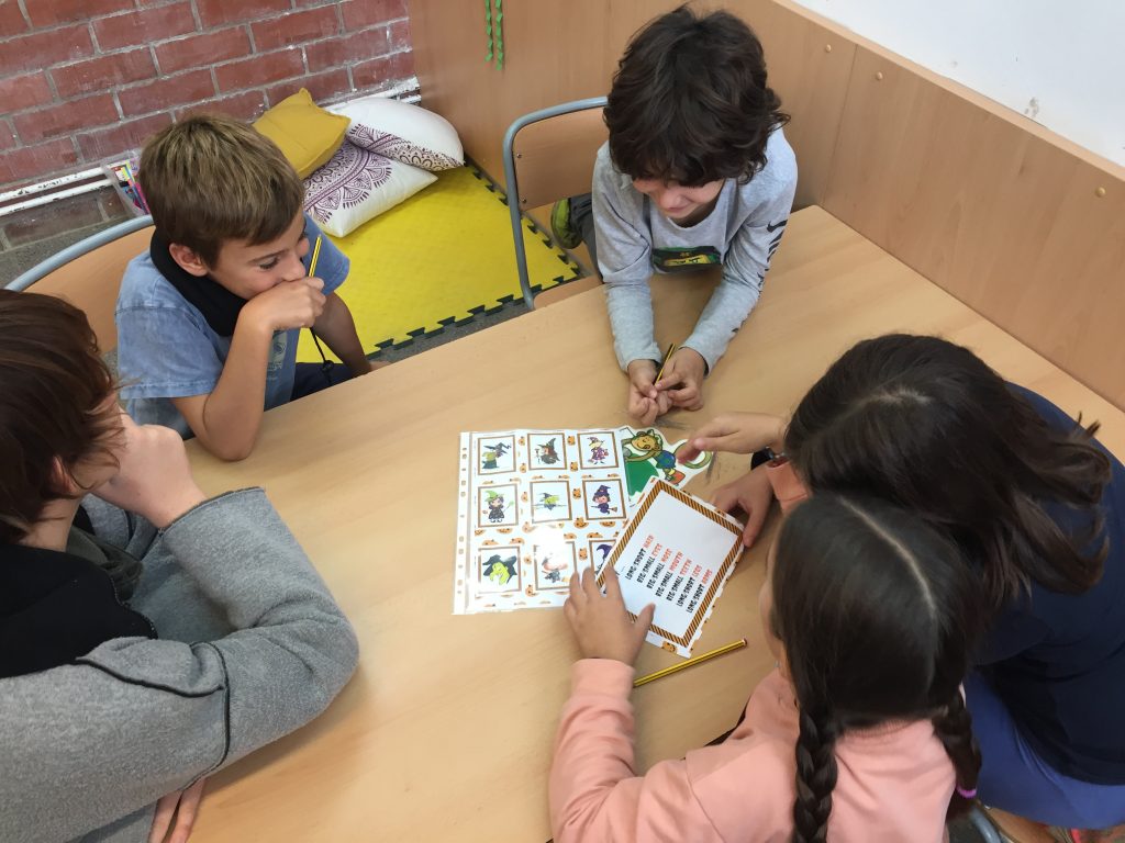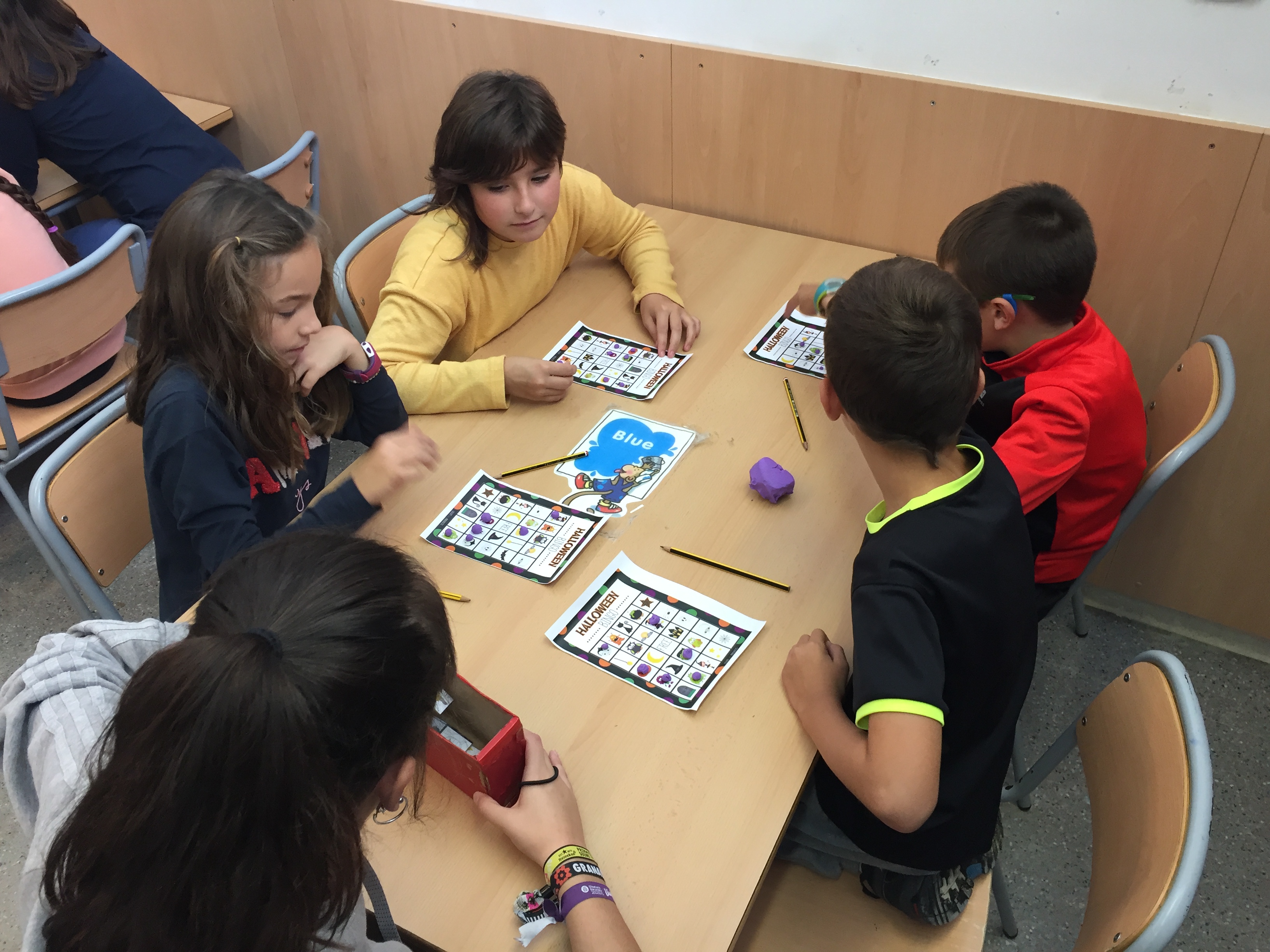 A cada taula hi havia alguna activitat diferent i cada cert temps anaven canviant i rotant per poder-les fer totes. Writings, listenings, speakings i també algun joc relacionat amb la festa.