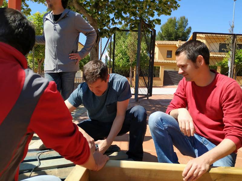 A les següents fotos podreu veure la feina que vam poder fer: estructura per a una cuineta per a la comunitat de petits, un espai de relax al porxo de l’escola, jocs de terra diversos (circuit de xapes, taulell d’escacs, twistter, xarranca i tres en ratlla) i un sorrall de 16 m2.