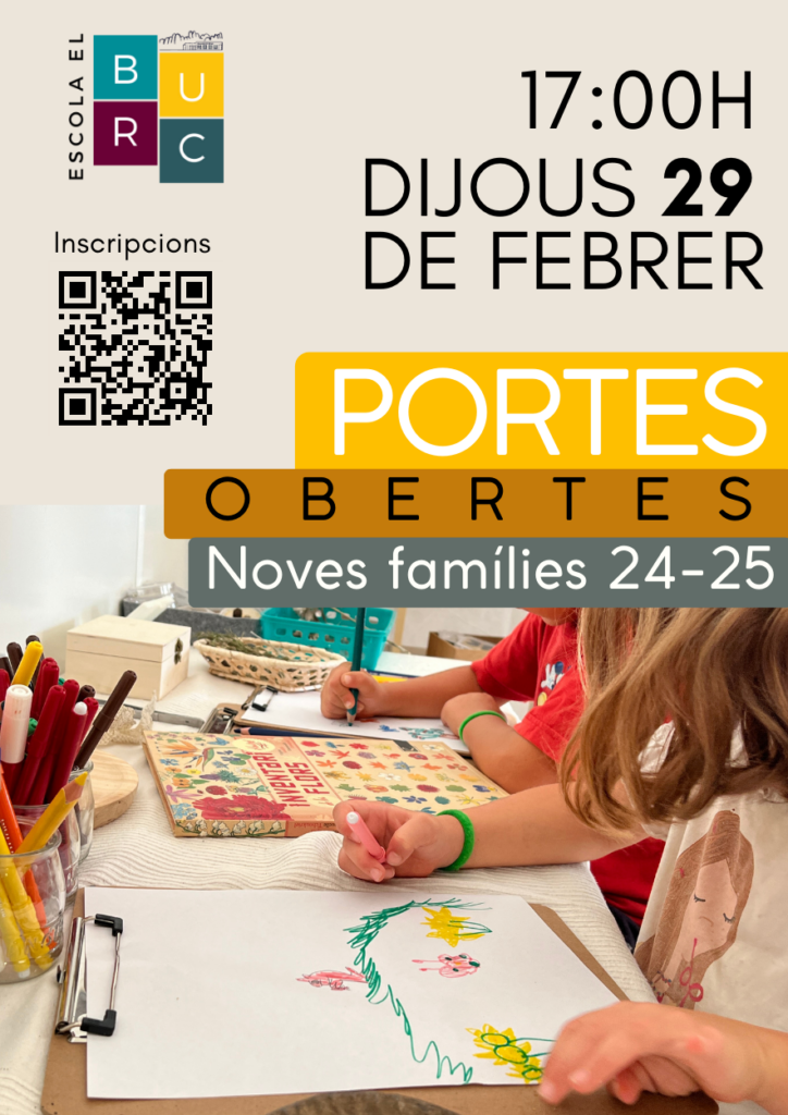 El proper dijous 29 de febrer a les 17:00 farem la jornada de portes obertes per aquelles famílies interessades a fer la preinscripció del curs 2024-25 a l’escola del Bruc i així poder conèixer el projecte educatiu i els diferents espais del centre.