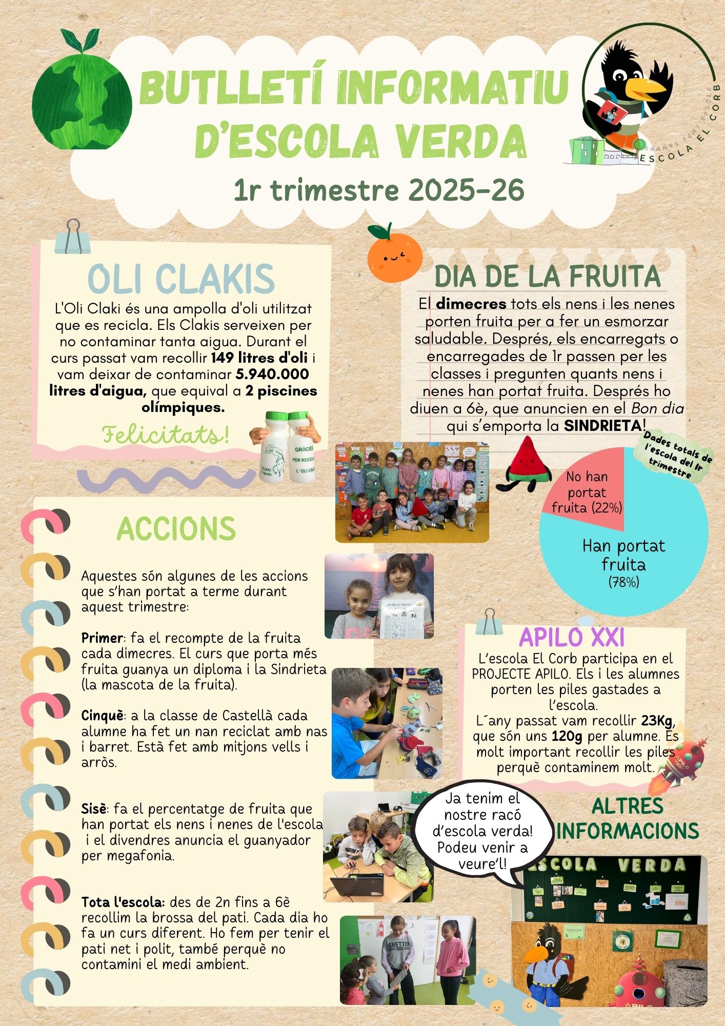 Hola famílies, Ja tenim aquí el primer butlletí d’escola verda d’aquest curs! Com veureu, l’han portat a terme els nens i les nenes de 5è. En aquest butlletí podeu veure algunes de les accions que s’han portat a terme aquest trimestre, així com el recull d’alguns projectes que ja tenim engegats: els OliClakis, l’Apilo i […]