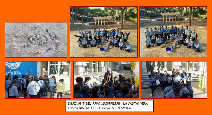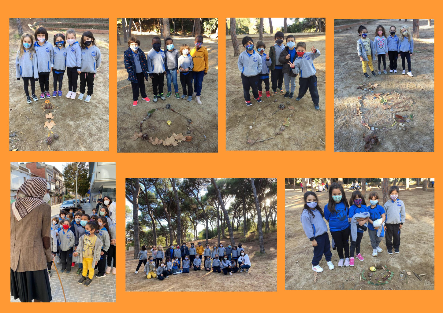 I quina sort tenim de poder gaudir molt a prop de l’escola del nostre fantàstic entorn natural: el Pati de l´Ós del Parc Dalmau. Poder observar els diferents colors de la tardor, manipular diferents elements i olorar-los, ens ha fet passar una tarda de dimarts de tardor ben distreta i divertida. Per grupets hem fet “creacions de Landart” a partir dels elements naturals que teníem i dels que hem trobat. La paraula Landart és una corrent d’art que utilitza el paisatge natural i els elements de la natura com a base per les seves creacions. De tornada a l’escola hem tingut la sorpresa de veure la Maria Castanyera que ens esperava per saludar-nos i desitjar-nos una bona castanyada.