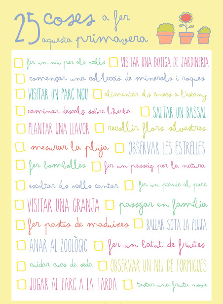 Ja és primavera!!! Aquí teniu un llistat amb 25 coses a fer aquesta primavera, amb idees tant per a petits com per als adults, i que podeu imprimir per a penjar a la nevera o al costat del calendari, per anar posant un “ok” a tot el que aneu fent.