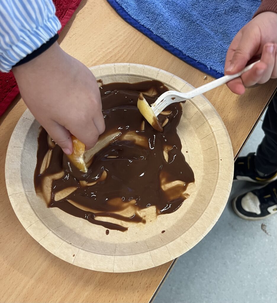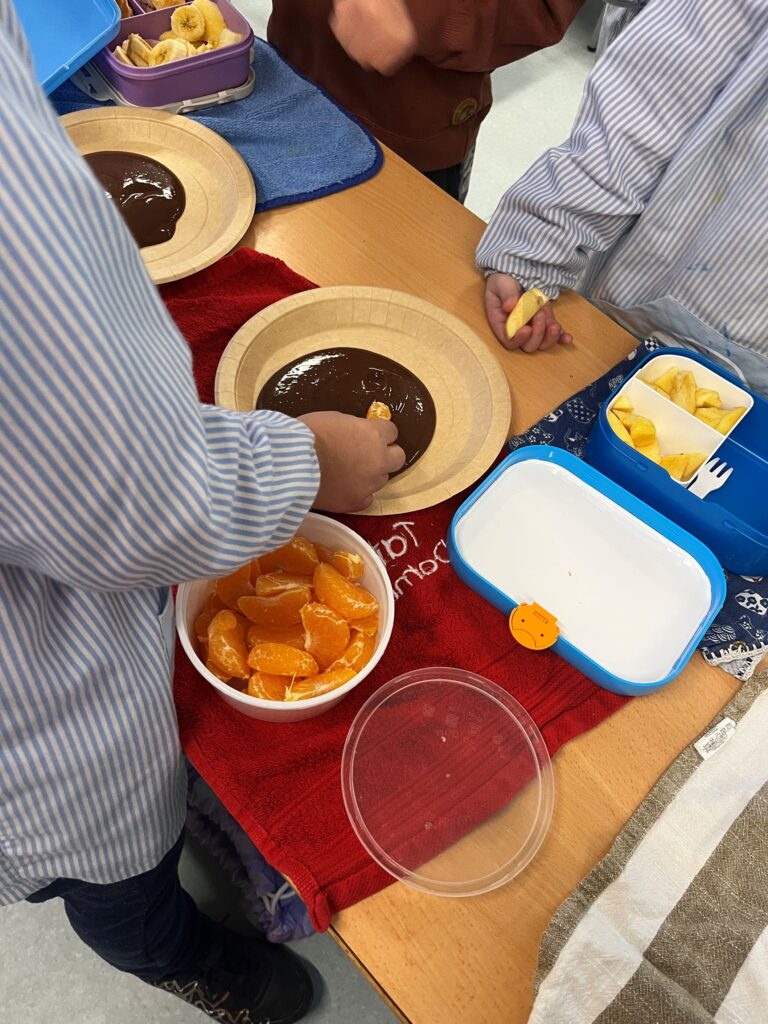 Els nens i nenes d’I5 hem tingut una sorpresa molt dolça: els Murris ens han portat xocolata desfeta. Aprofitant que és dilluns i portem fruita per esmorzar, l’hem sucada a la xocolata.