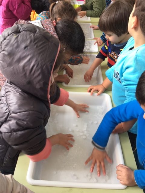 L’ experimentació va evolucionant i canviant al llarg del curs, segons les necessitats dels nens i nenes i segons els canvis estacionals que te la natura amb materials quotidiana. Per exemple a la tardor manipulen diferents fruits, a l’hivern gel…