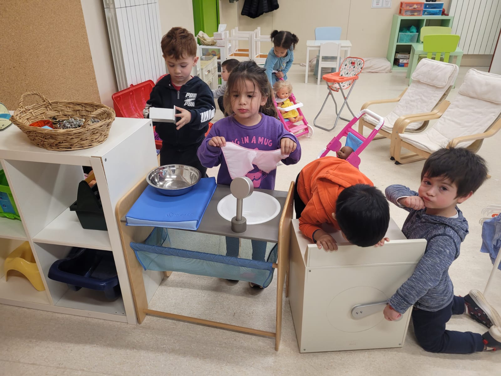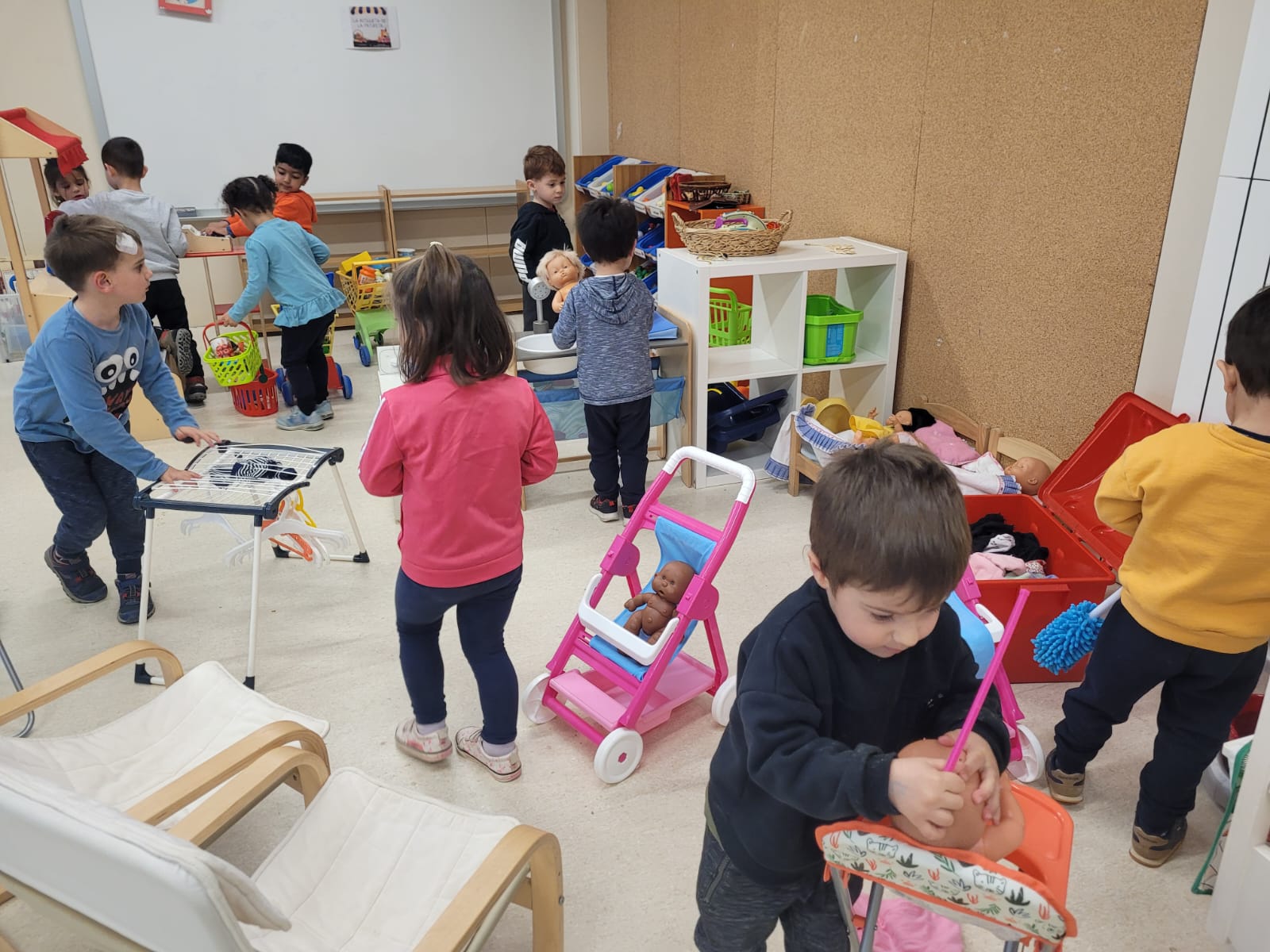 Durant el 2n trimestre, els infants d’I3 van començar a anar-hi en sessions de mig grup. El joc simbòlic és molt important perquè els infants combinen situacions reals i imaginàries, imitant el món que els envolta. Es tracta de fer “com si fossin” cuiners/es, botiguers/es, metgesses/es,… Amb aquest tipus de joc es treballa l’empatia, el llenguatge, la comunicació, les habilitats socials i es fomenta la imaginació i la creativitat.