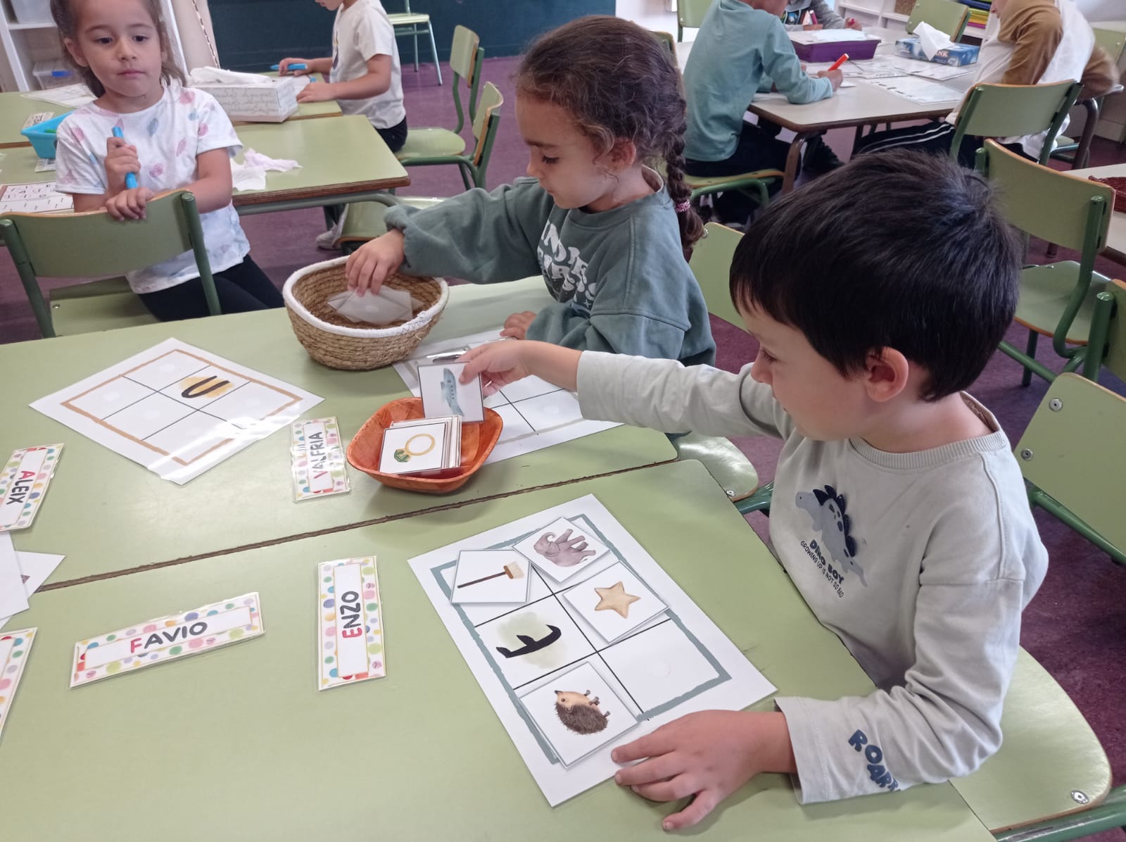 Ens organitzem en tres grups barrejant infants de les dues aules, fet que afavoreix la convivència, la cooperació i l’aprenentatge entre iguals. Cada setmana, els grups canvien de racó de manera que, al llarg de tres setmanes, tots passen per les diferents propostes.
