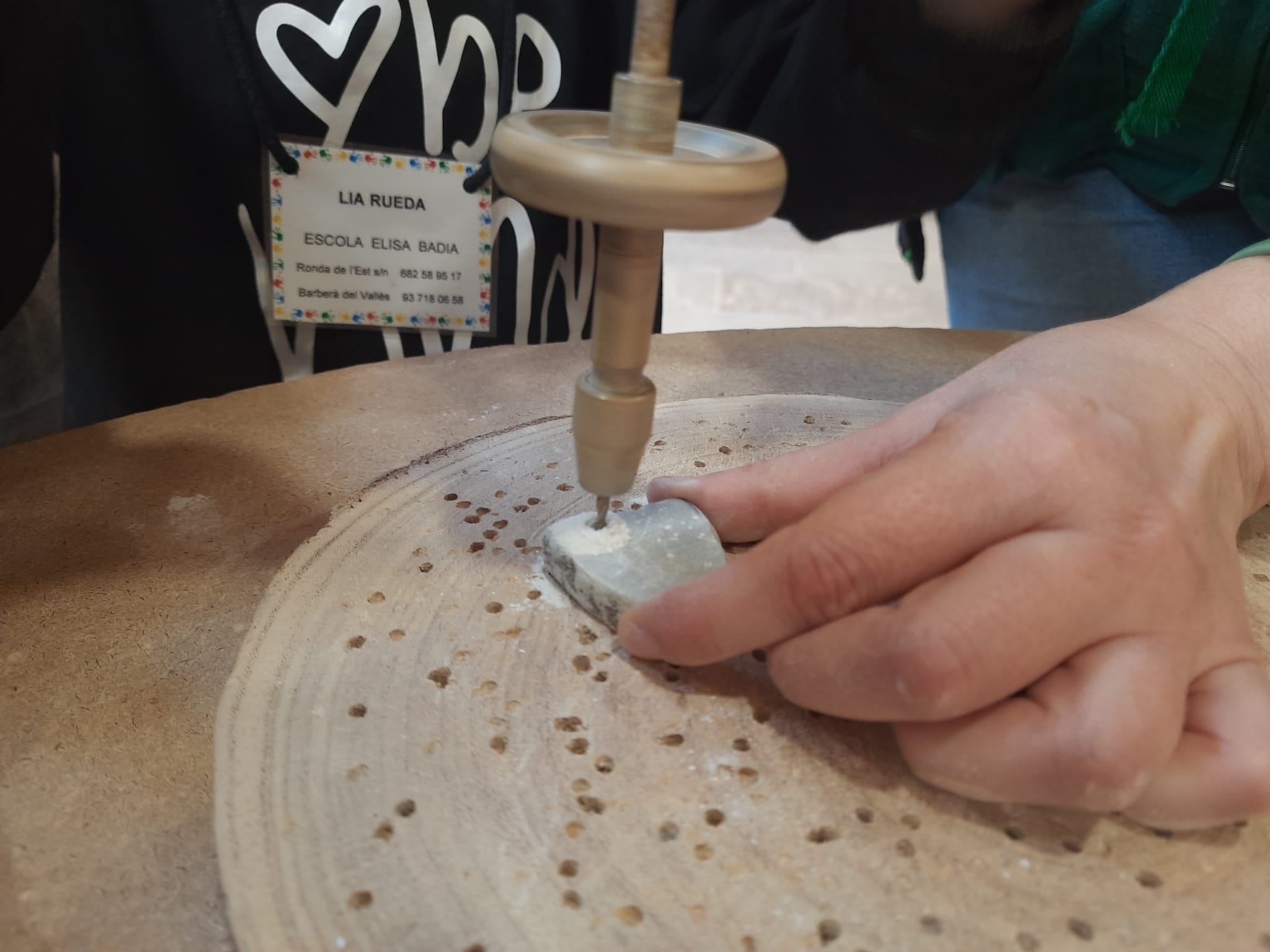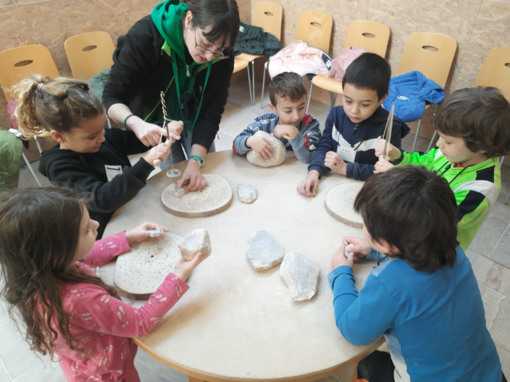 La jornada va començar amb un taller de joguines prehistòriques, on els infants van treballar amb pedres de talc per polir-les i fer forats amb una eina única anomenada ballarina, la mateixa que es feia servir fa milers d’anys. Una activitat manual que els va connectar amb les tècniques dels nostres avantpassats.