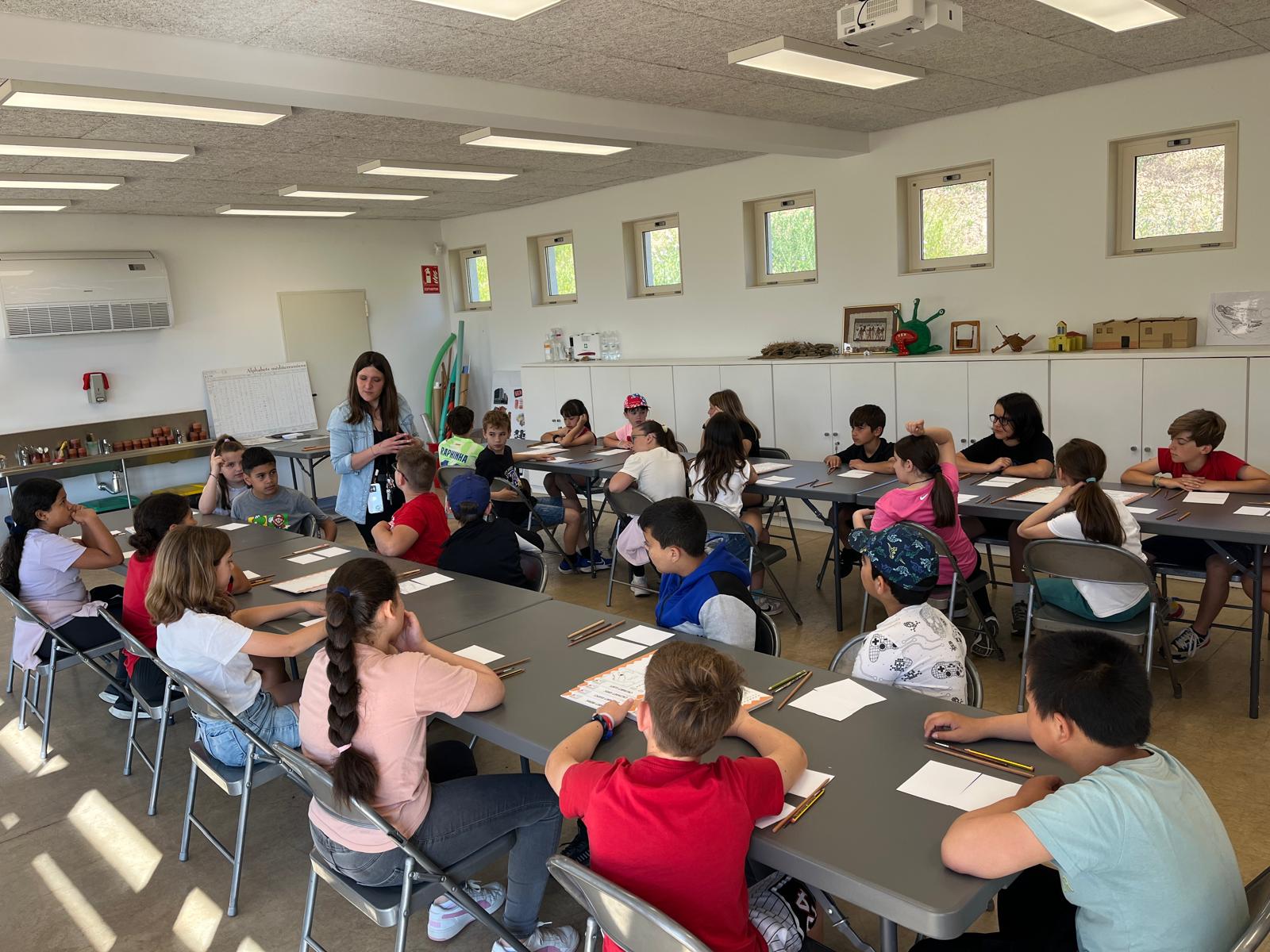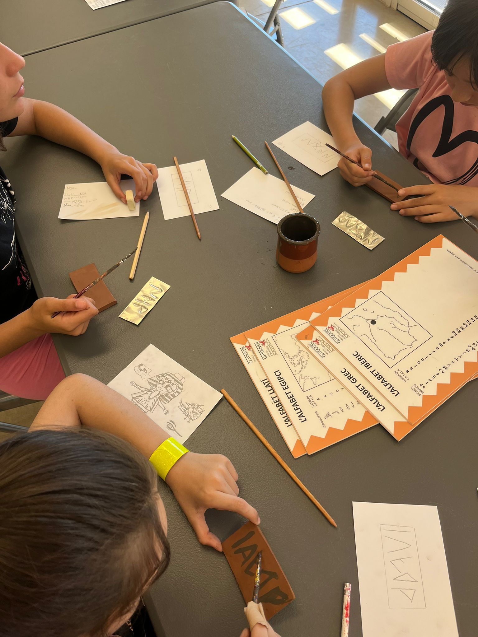 L’activitat es va dividir en dues parts, i cada classe les va anar fent alternativament. En una de les parts, vam fer un taller molt original: vam escriure el nostre nom en quatre llengües de civilitzacions antigues —egipci, grec, llatí i ibèric— i després els vam gravar en metall i en fang per poder-los endur a l’escola com a record. Va ser molt interessant descobrir com escrivien els antics pobles i veure les diferències entre els seus sistemes d’escriptura.