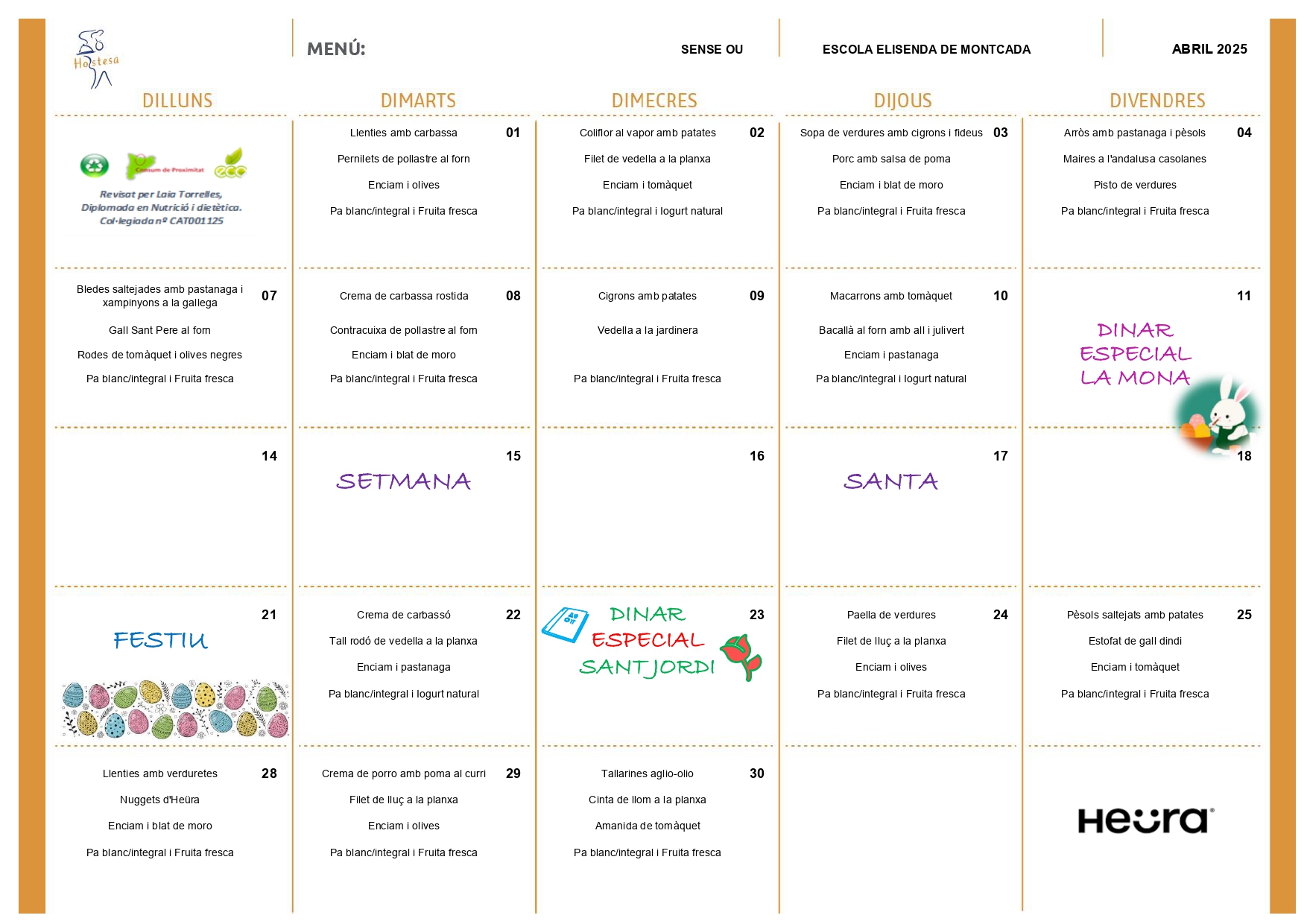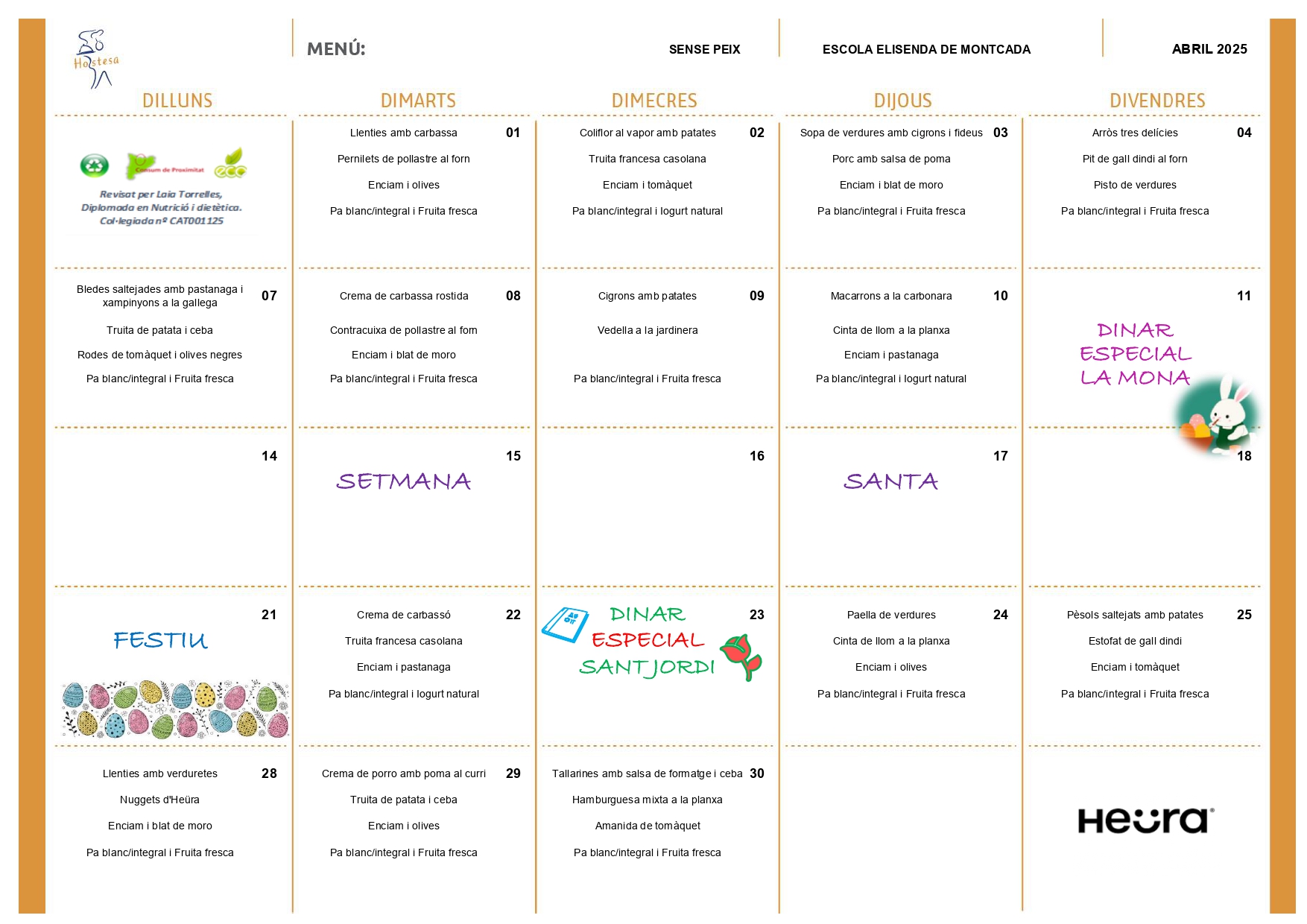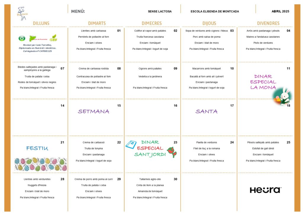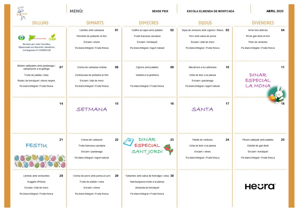 A continuació, us deixem els diferents menús del menjador del mes d’abril: