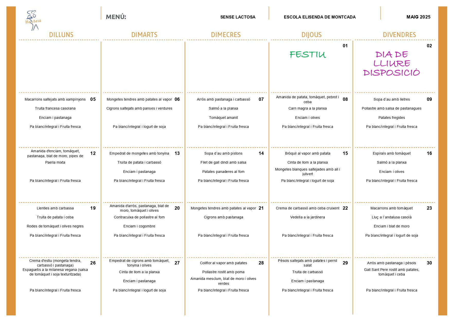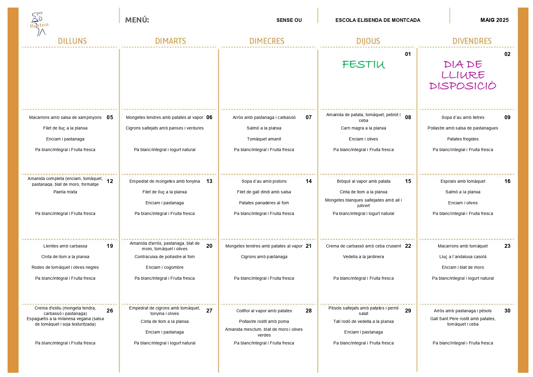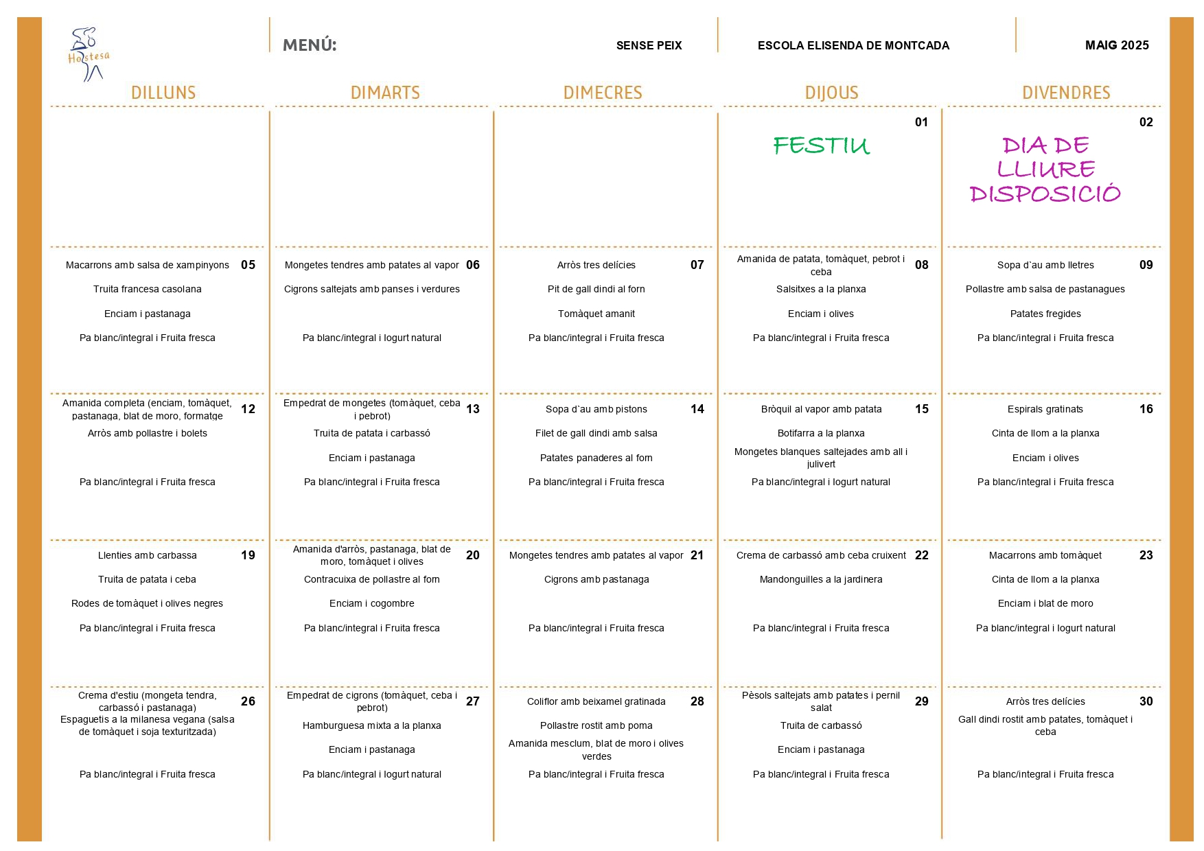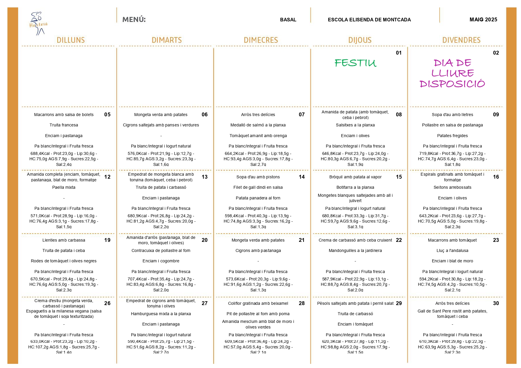 A continuació, us deixem els diferents menús del menjador del mes de maig: