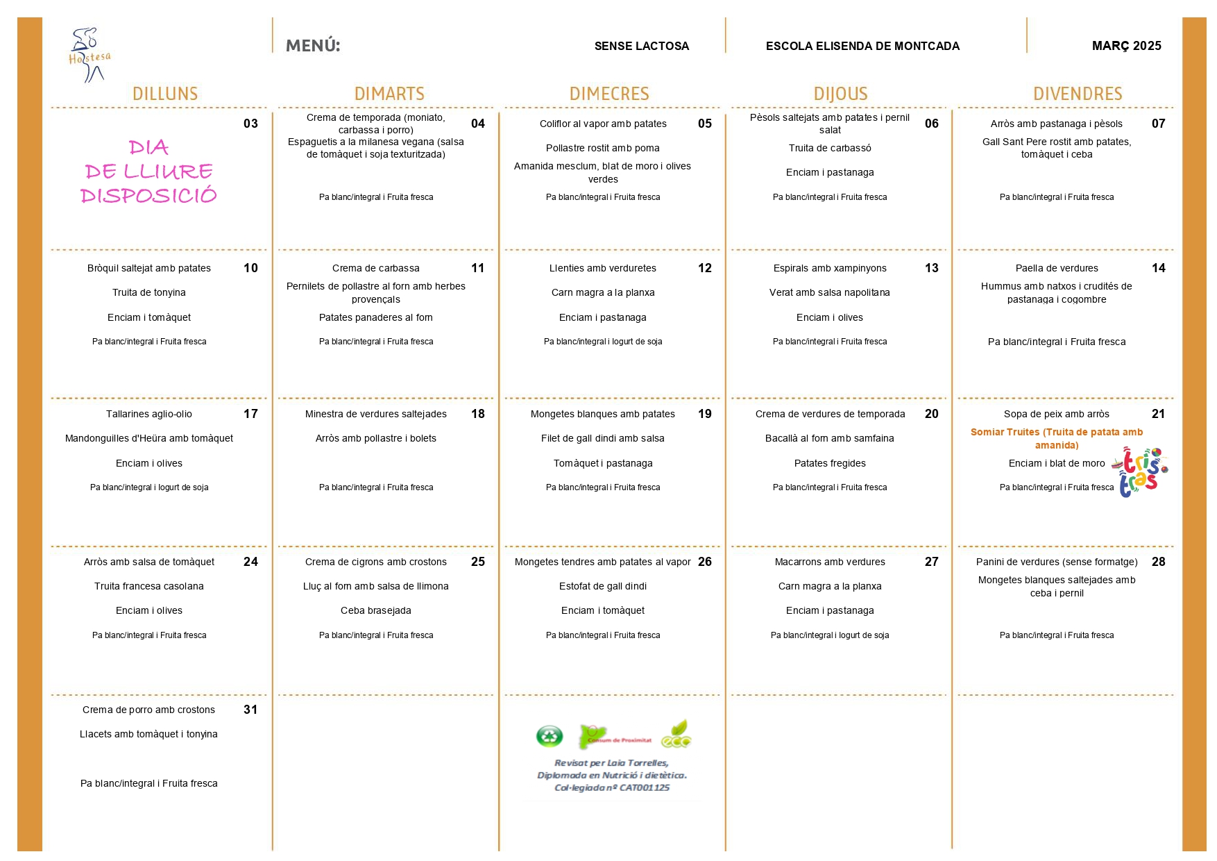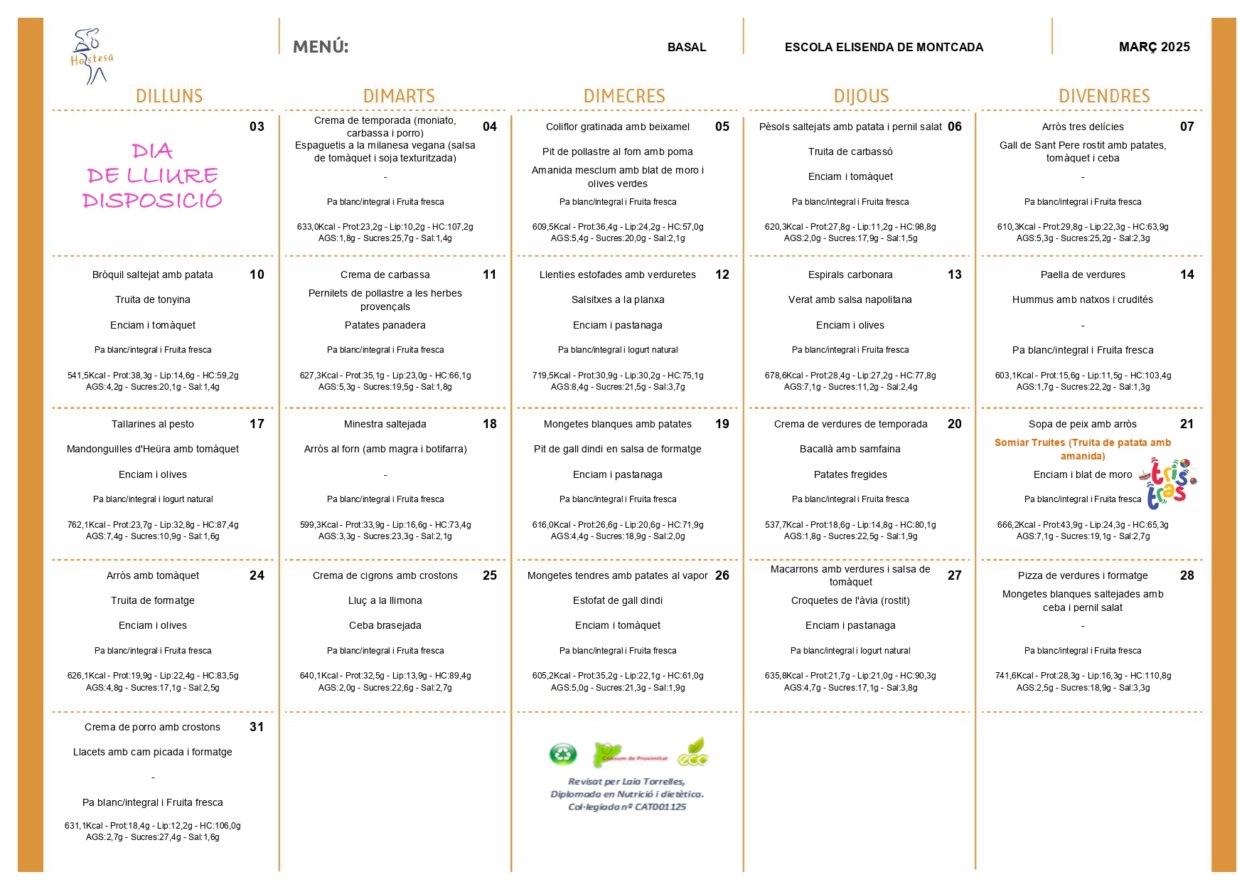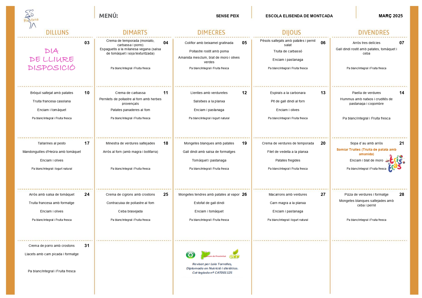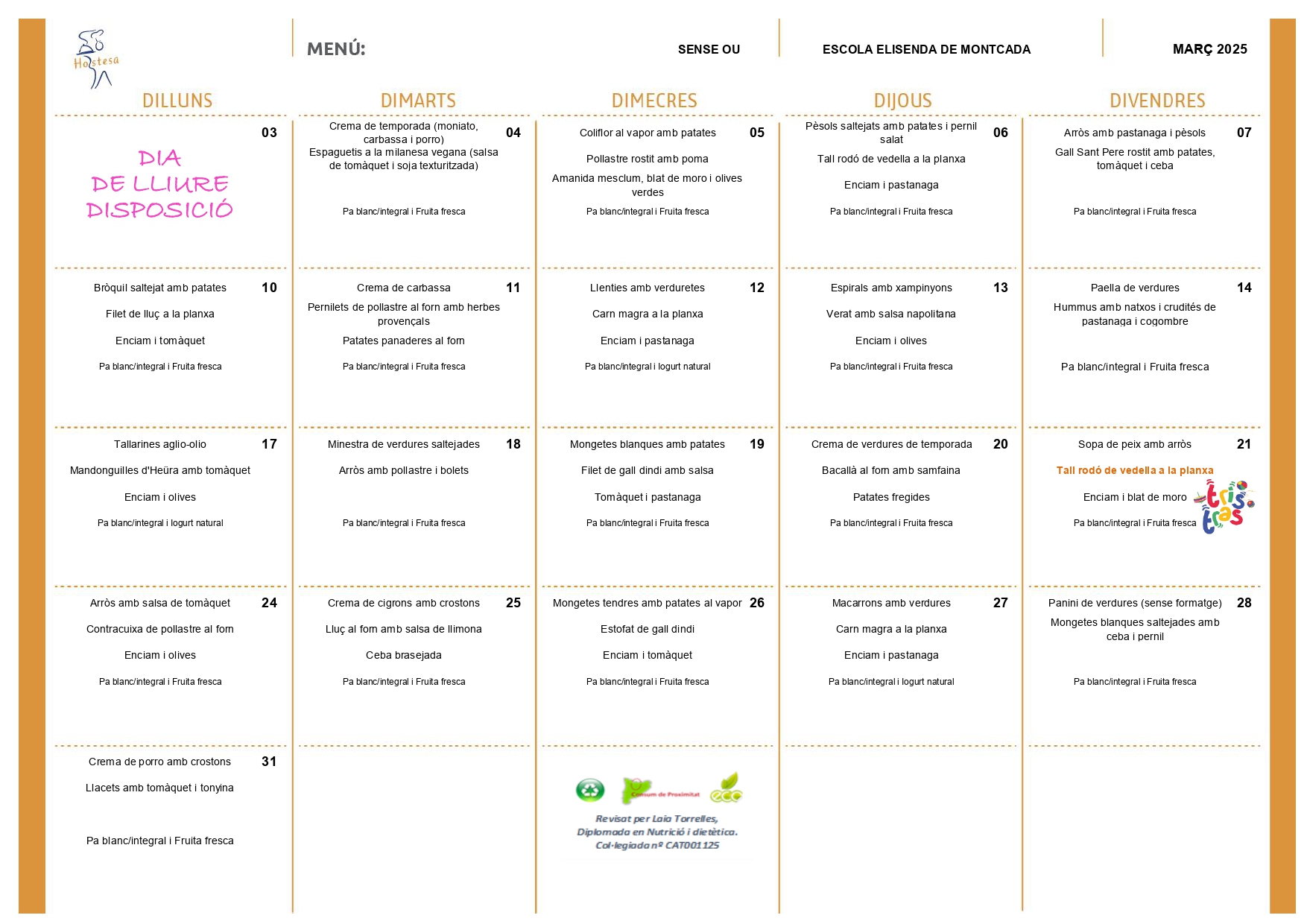 Menús del mes de març Feu un comentari / Per admin / 25 de febrer de 2025 / General Portada A continuació, us deixem els diferents menús del menjador del mes de març: