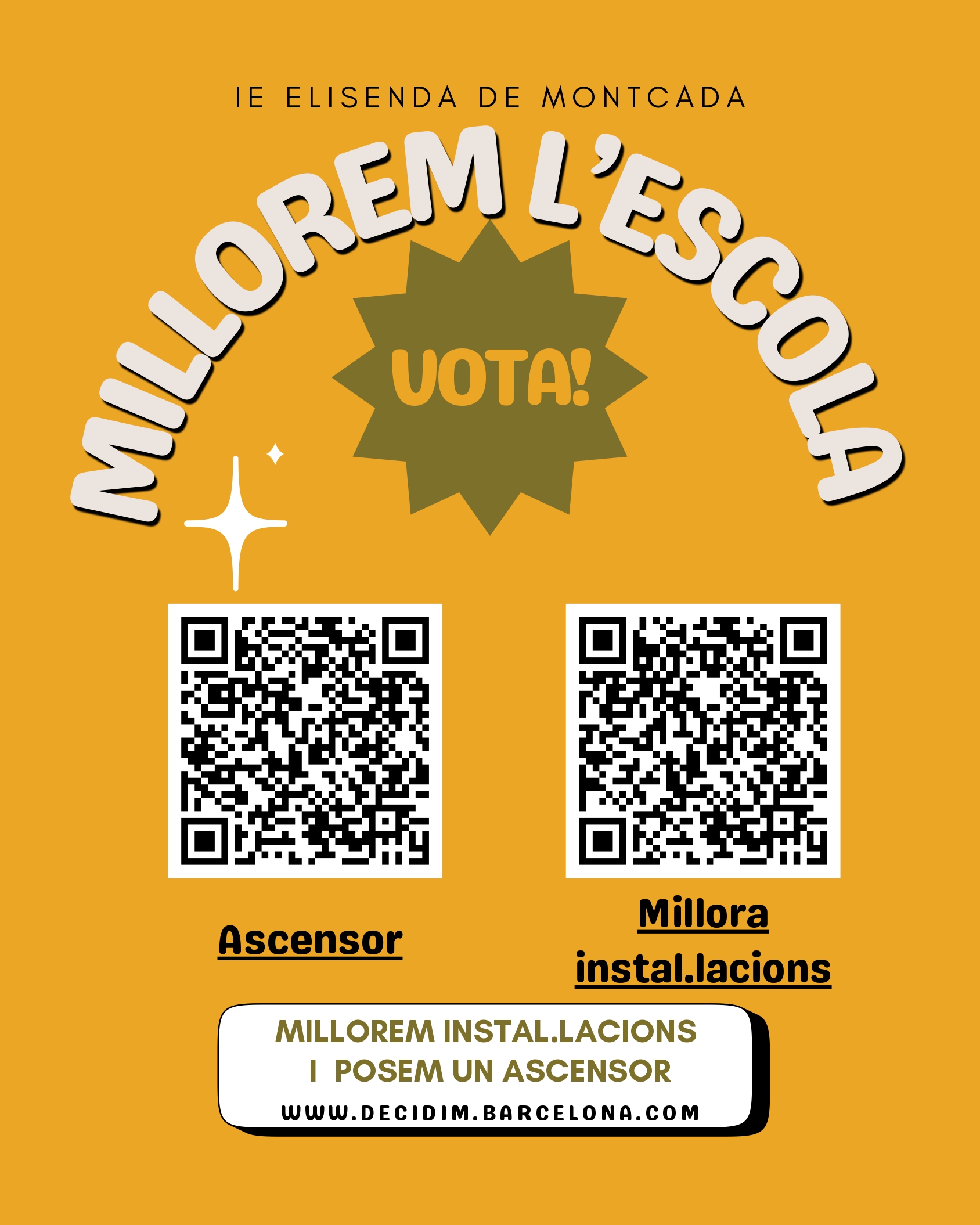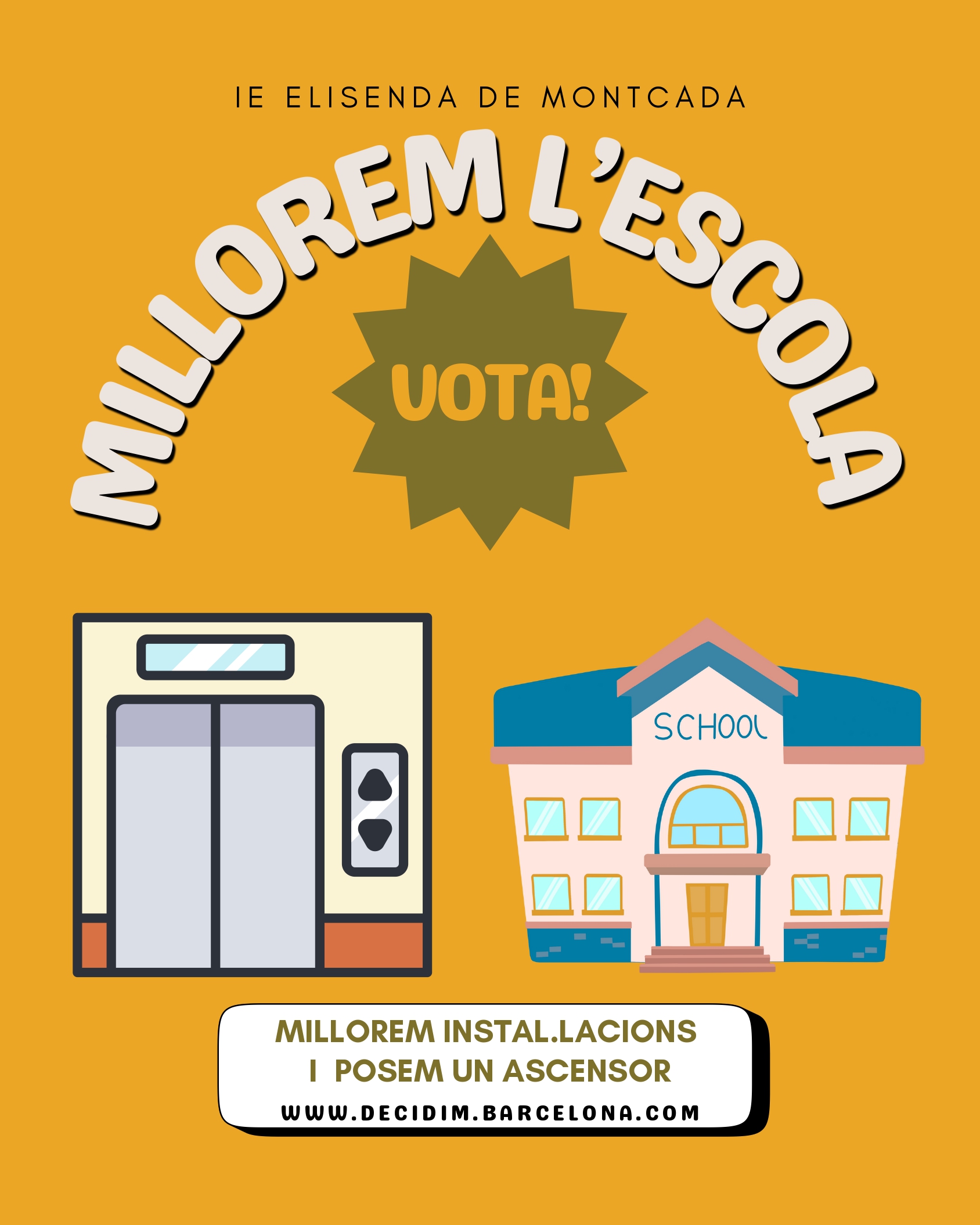 Com bé sabeu, estem en ple procés de votació de les propostes presentades per als Pressupostos Participatius 2024-2027. Entre les iniciatives del nostre barri, hi ha una proposta important per millorar l’Escola Elisenda de Montcada, que inclou la instal·lació d’un ascensor i la millora de les instal·lacions dels lavabos.