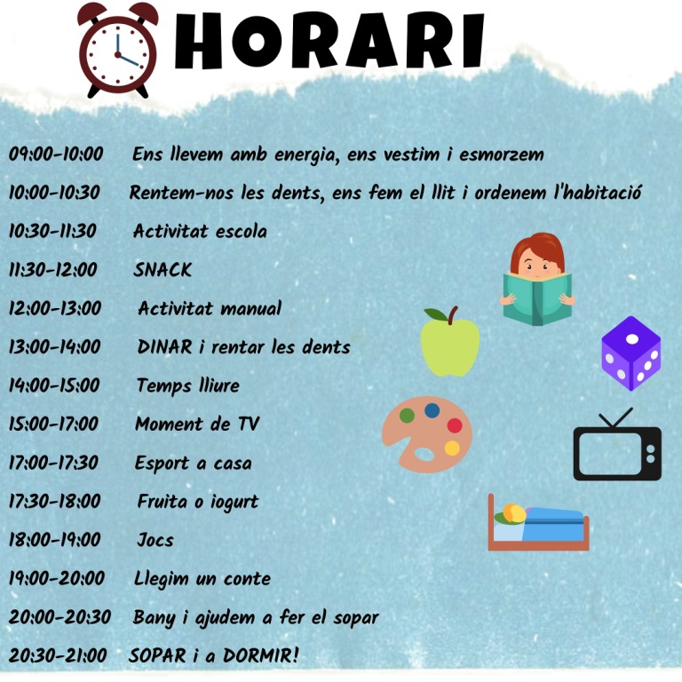 És per això que des de l’escola us compartim una idea: establir amb els petits de casa un horari. Així, de ben segur que el dia a dia se’ls farà menys feixuc.