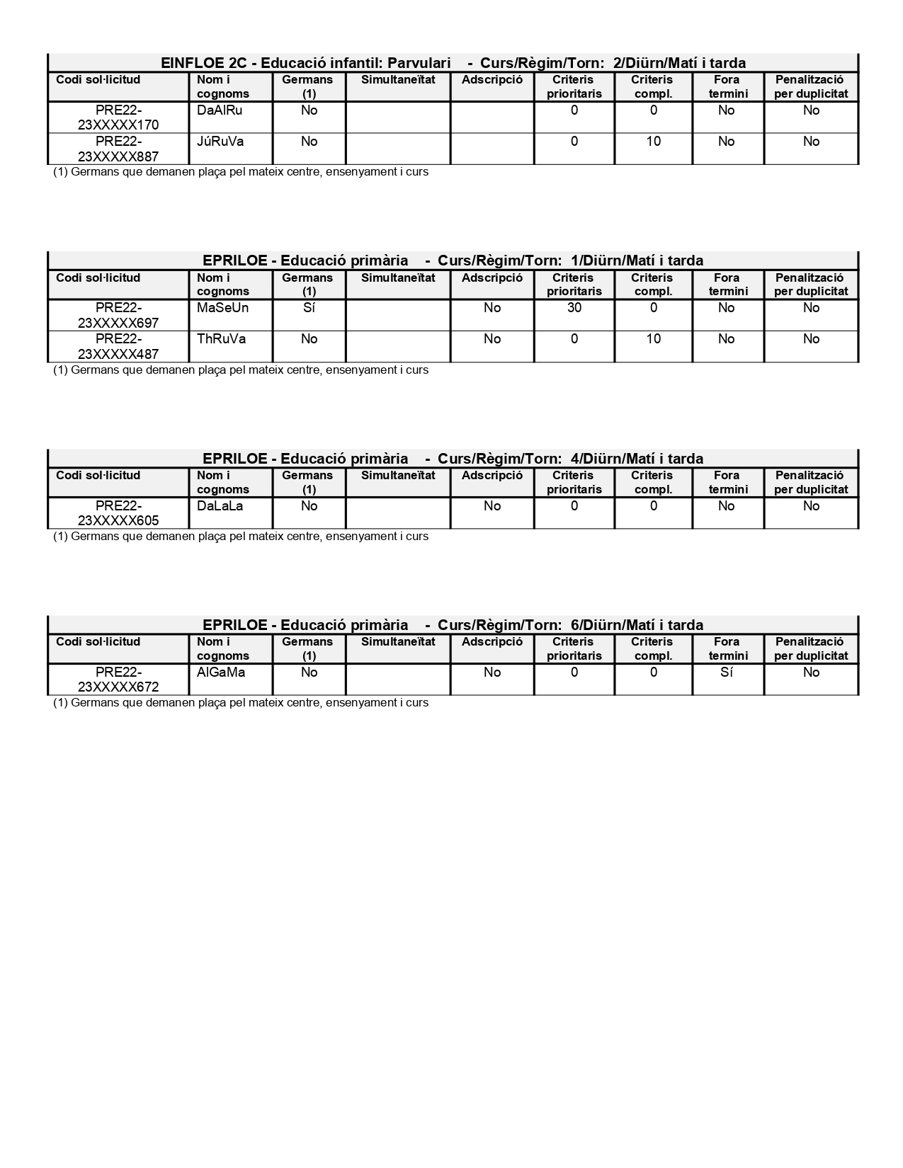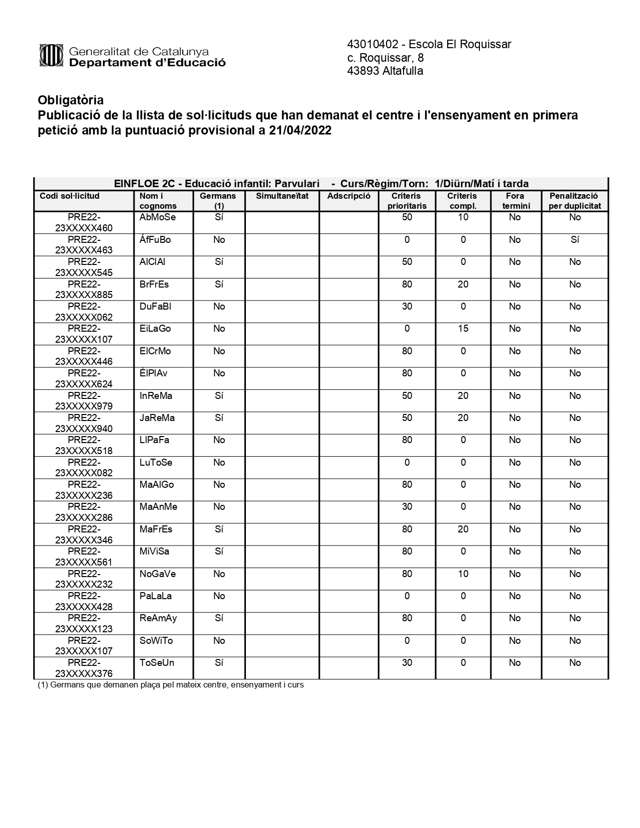 Adjuntem el llistat amb les puntuacions provisionals de les sol·licituds per fer la matrÃcula al centre.
