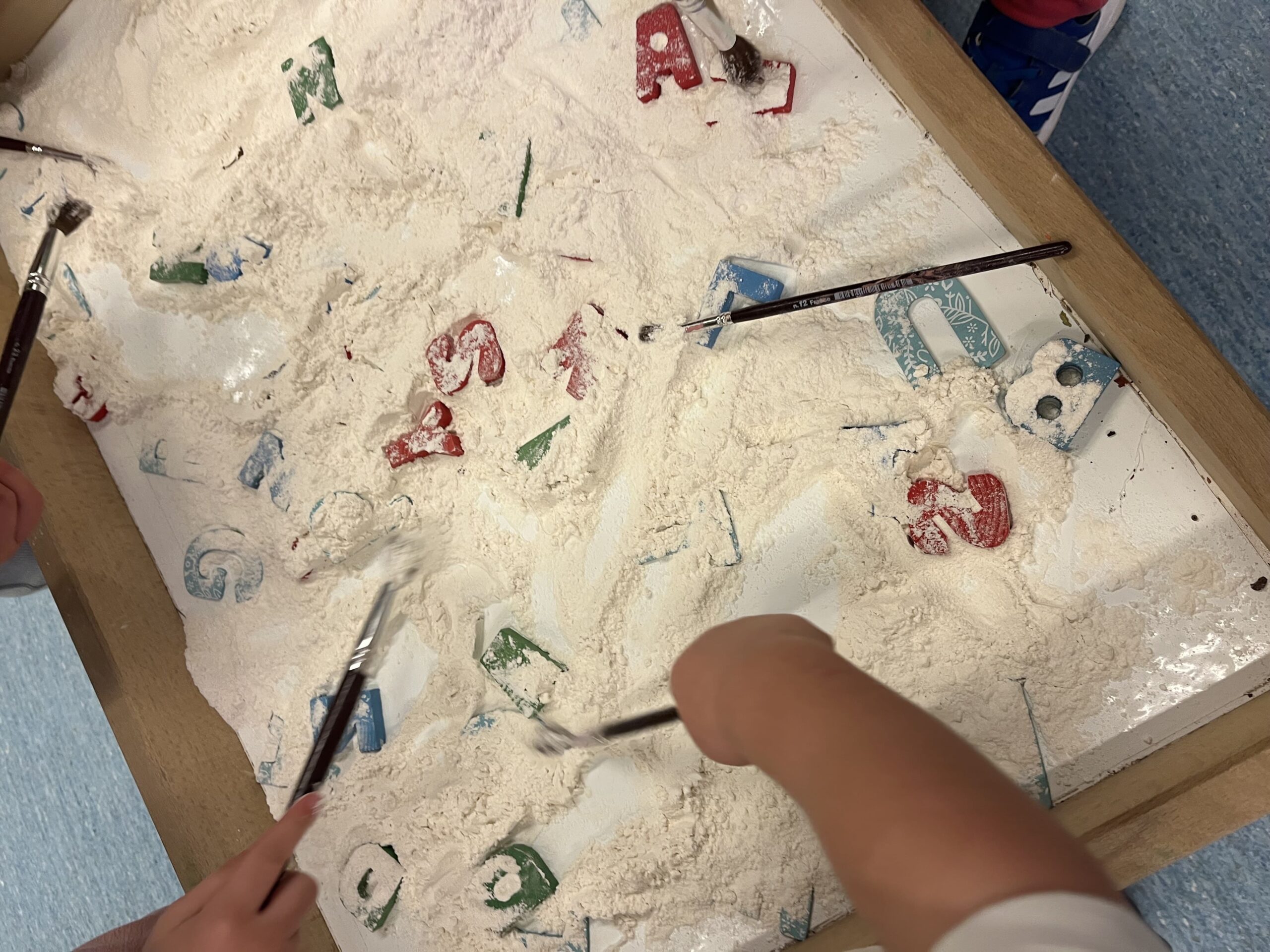 Amb aquesta mirada curiosa, hem iniciat diverses propostes de joc i exploració. Hem jugat a ser caçadors de lletres, buscant-les per l’aula i pels espais de l’escola. També les hem descobert amagades a la farina, tot experimentant amb les mans i els sentits. I ens ha fet molta il·lusió trobar lletres en la nostra roba, reconeixent formes que ens resulten familiars.