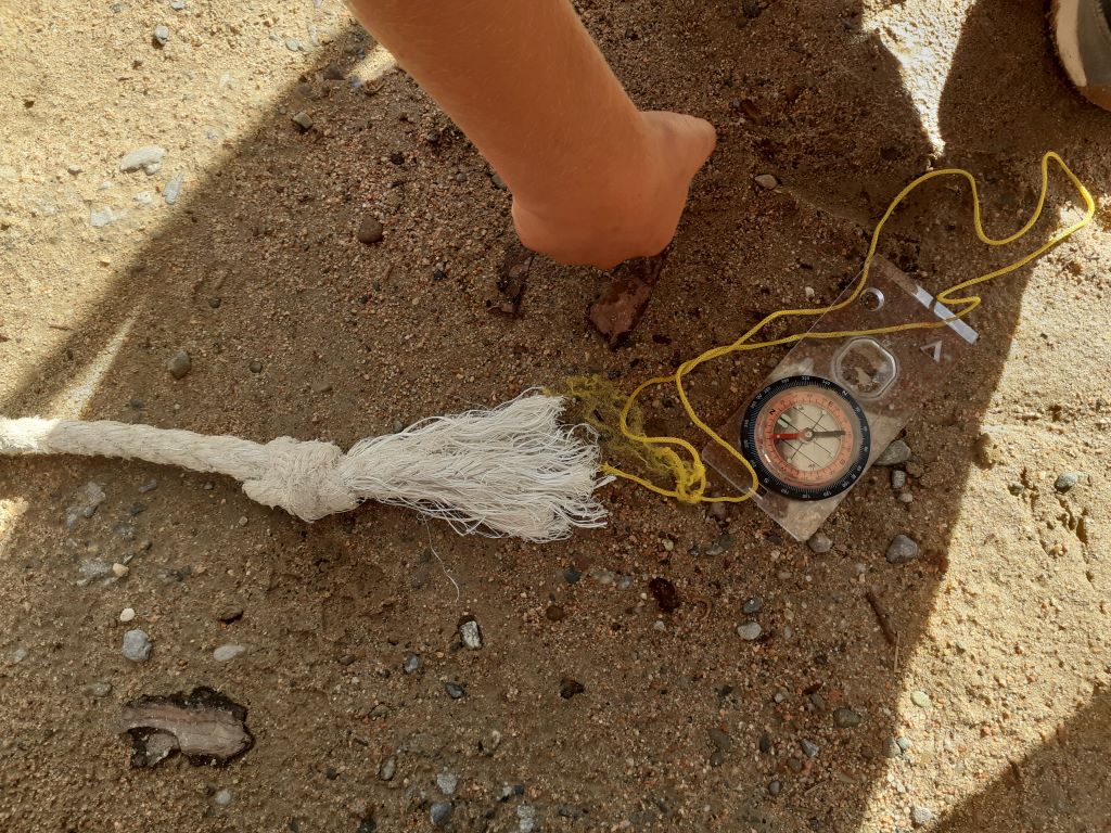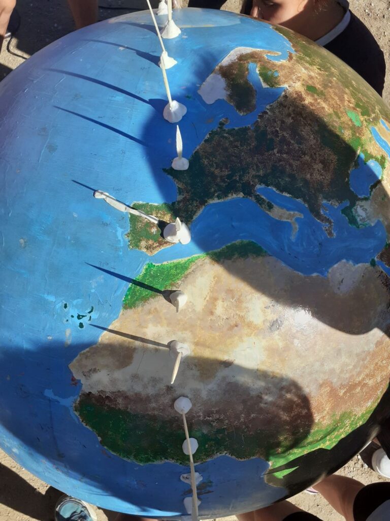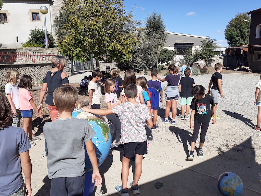 Sortint, carregats amb tot el material i la terra paral·lela, amb la conversa prèvia ja se sap què és  necessari: cercar la direcció nord-sud (amb l’ajuda d’una brúixola) per tal d’orientar l’eix de rotació de la maqueta de la terra i que caldrà situar (a nivell) la ubicació de l’escola en el punt més alt de l’esfera. Llavors: imaginar… imaginar que ens enlairem amb coet i podem veure la Terra des de molt amunt!
