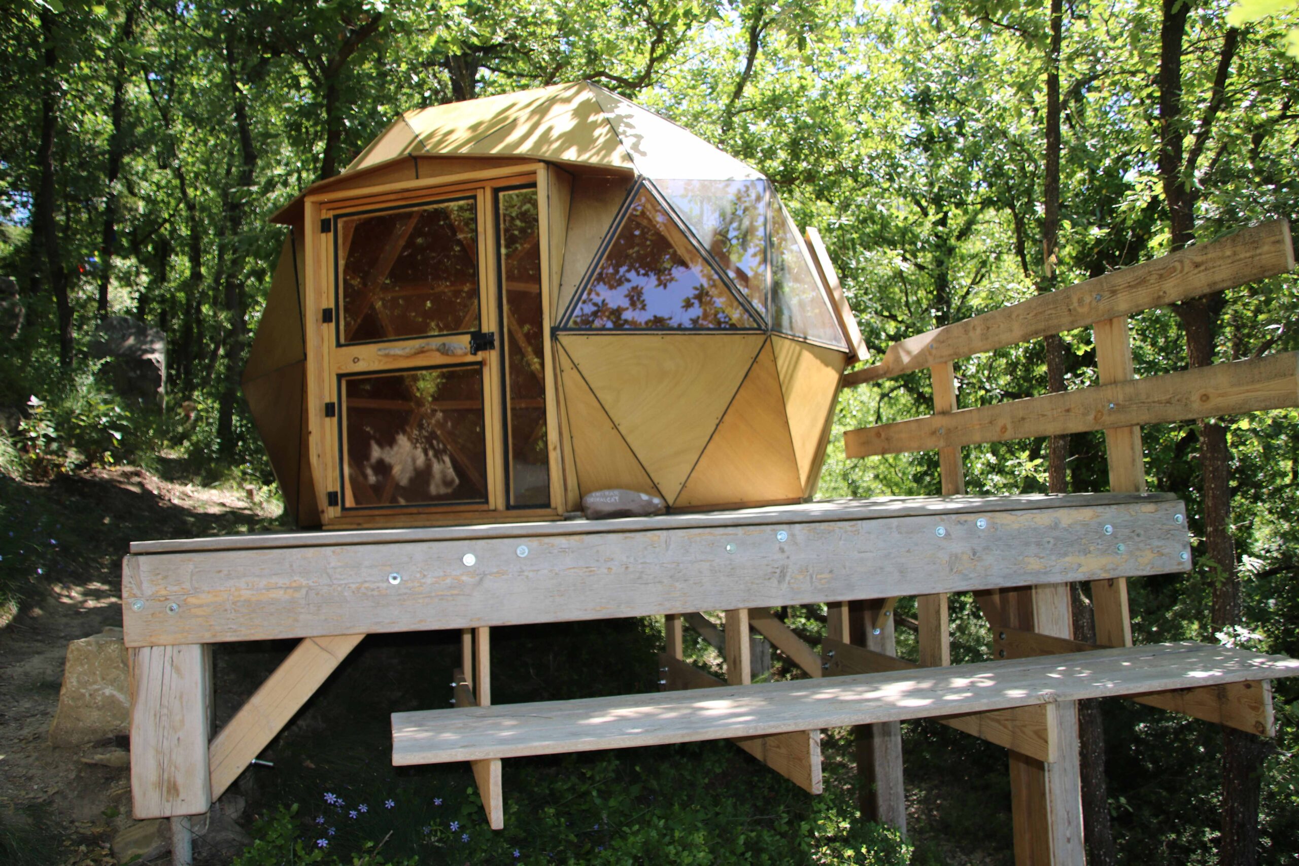 Durant la visita, en Tomàs ens va explicar tot el procés de disseny, càlcul i construcció dels triangles que conformen l’estructura de la cúpula. Va ser molt interessant veure com una idea es transforma en una construcció real, feta amb materials naturals i integrada en l’entorn.