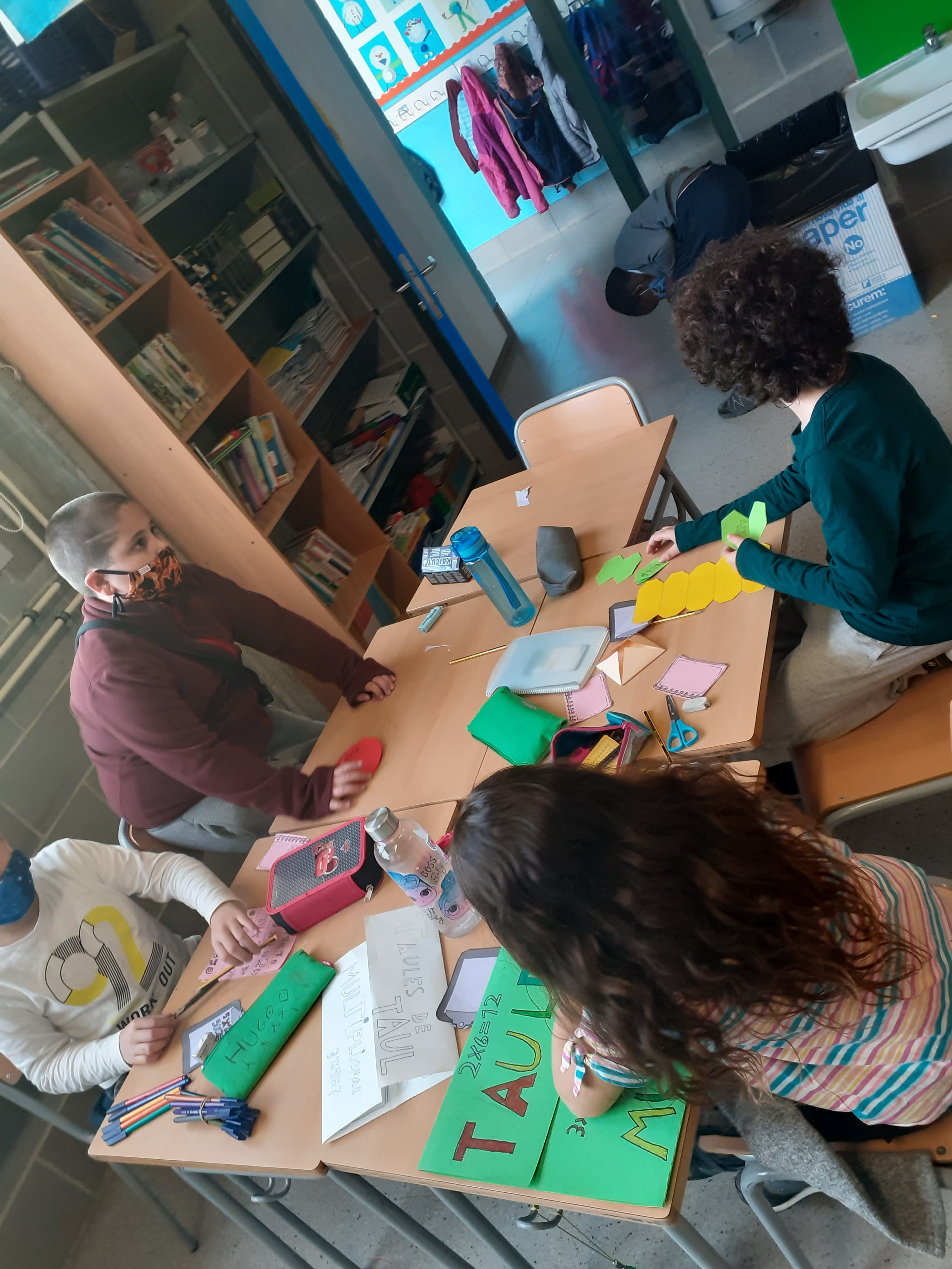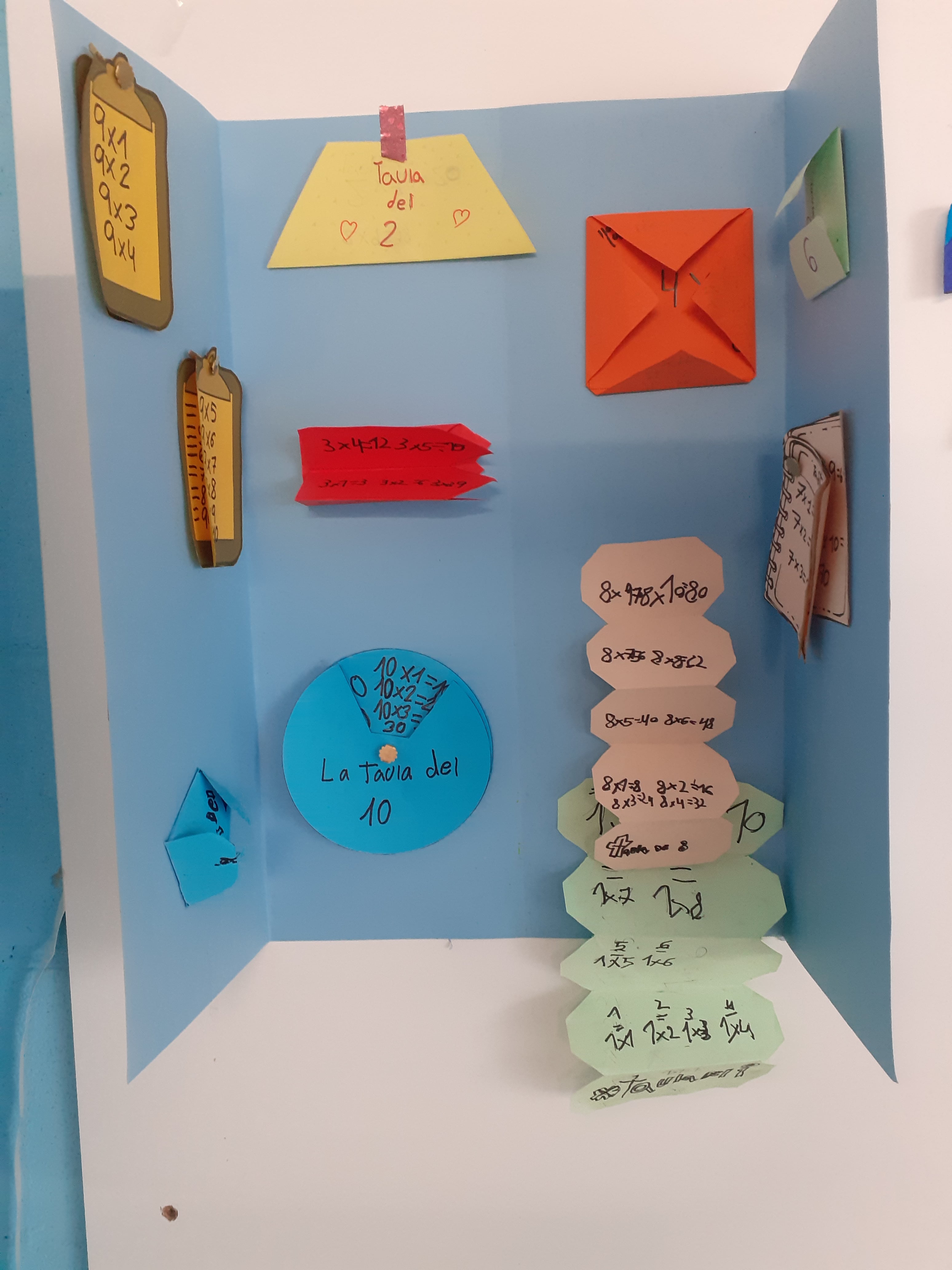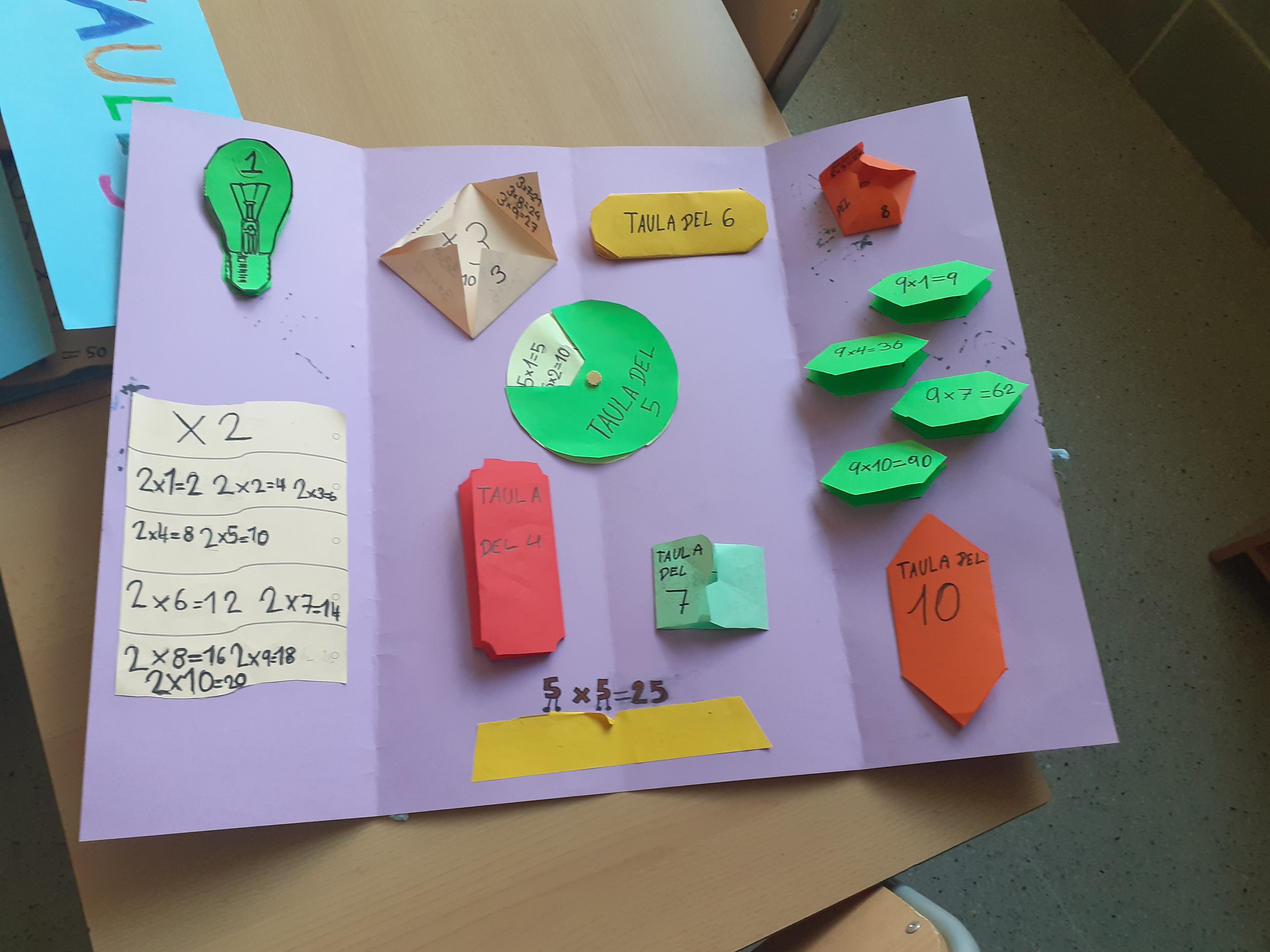 Com els hem fet? Molt fàcil! Ens hem distribuït en grups i, gràcies a unes plantilles pensades per a fer aquests llibres desplegables, hem anat organitzant les taules de l’1 al 10 per tota la cartolina. Després li hem donat forma de tríptic i ja ho teníem!