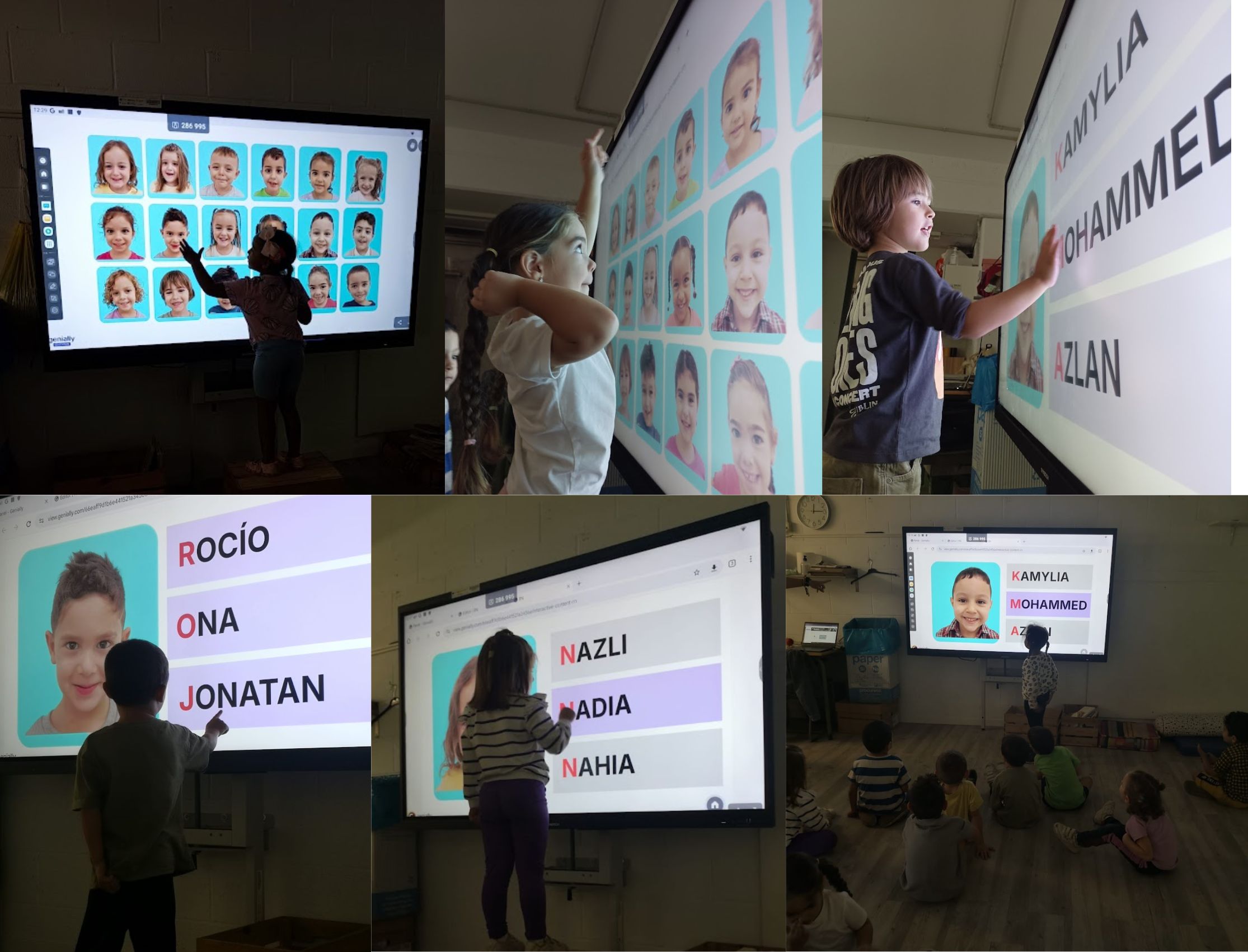 Ara que ja coneixem el nostres noms, els nens i nenes d’i4 juguem a reconéixer els noms dels nostres companys i companyes al panell digital. Triem la foto i escollim l’opció correcta entre els tres noms que surten. Ens agrada molt veure’ns tant grans a la pantalla!!!