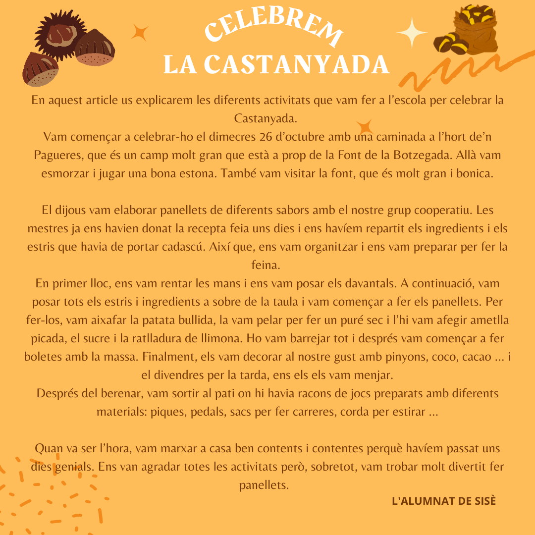GRANS: Celebrem la Castanyada a 6è! Feu un comentari / Per Infants de 6e / 4 de novembre de 2022 / 6è GRANS Portada Primària SORTIDES / Castanyada, CICLE DE GRANS: SISÈ Si voleu veure les fotografies, premeu aquest enllaç