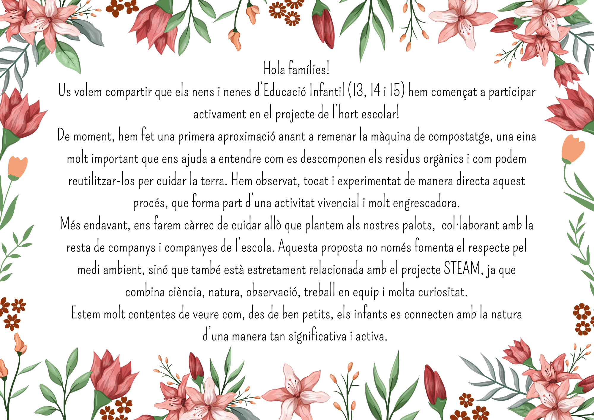 APRENEM A CUIDAR EL NOSTRE HORT ESCOLAR Feu un comentari / Per admin / 4 d'abril de 2025 / General I3 I4 i I5 Infantil Portada Projecte STEAM@L’H🖤rta Per veure les fotos cliqueu AQUÍ