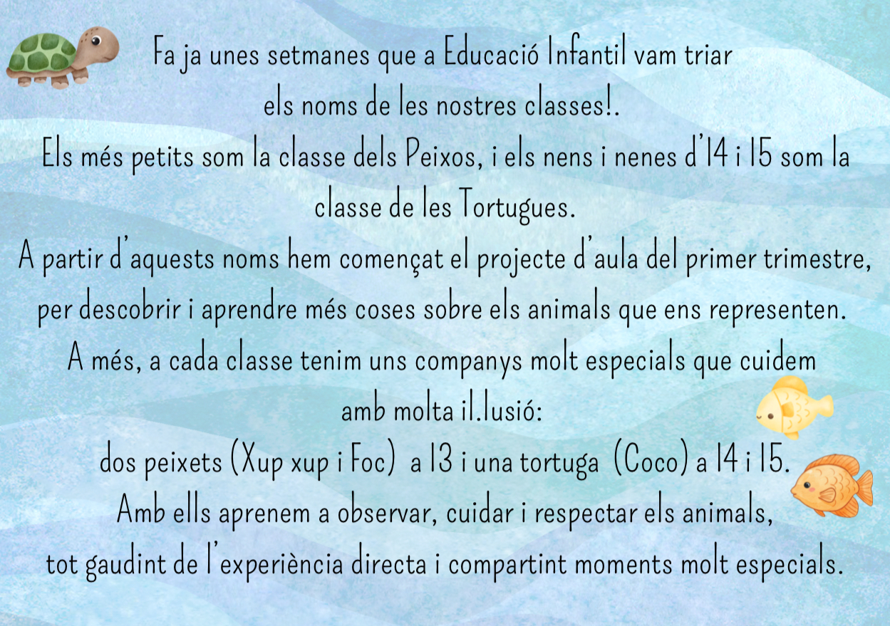 CLASSE DELS PEIXETS I DE LES TORTUGUES Feu un comentari / Per admin / 27 d'octubre de 2025 / General I3 I4 i I5 Infantil Portada Cliqueu AQUÍ per veure les imatges.