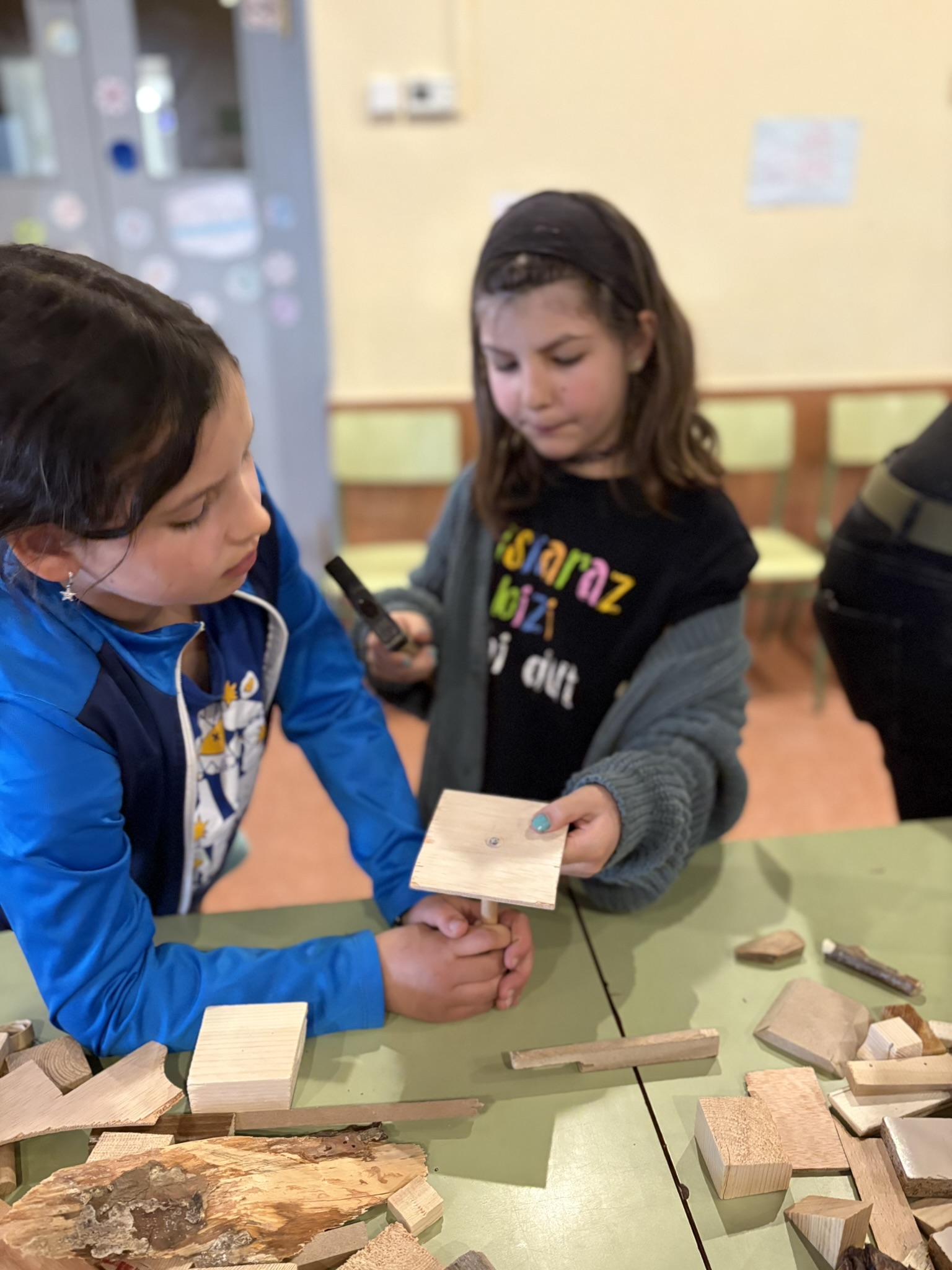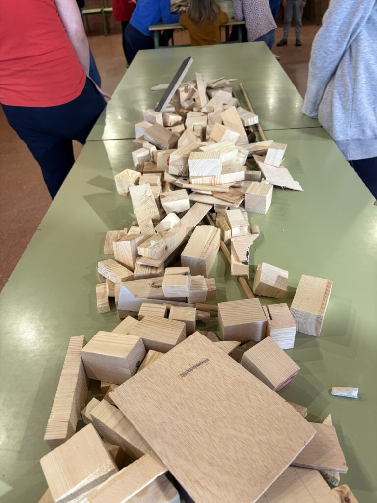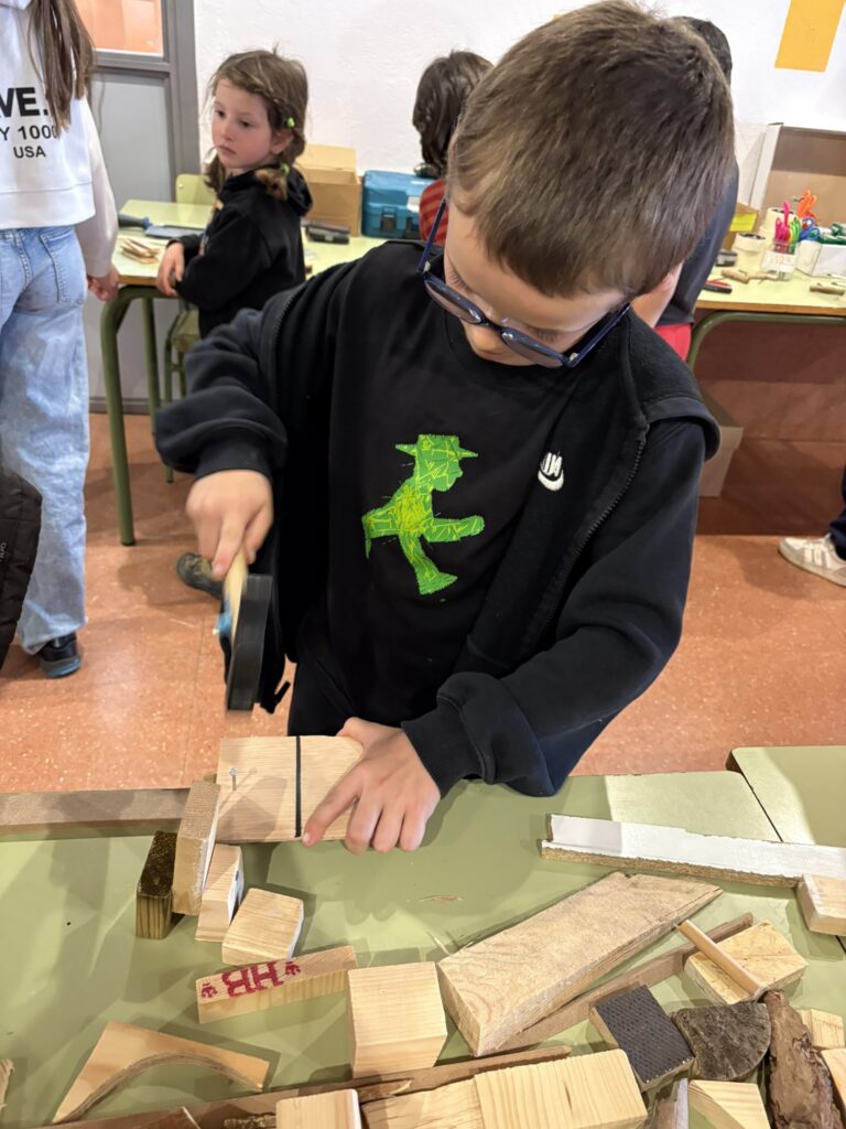 Seguim treballant l’art amb les companyes de la Rural Utòpica. La Vanessa, la Marta i la Vio ens porten materials molt interessants. A la primera sessió, en assemblea, els infants de l’escola van exposar que els hi agradaria treballar la fusta i…desig concedit! Ens porten fustes de diferents tipus i mides i materials i accessoris per treballar-la.