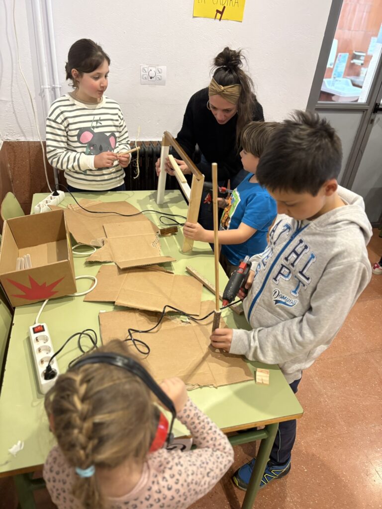 A la segona sessió, iniciem el taller amb el visionat d’un vídeo sobre com un artista crea, amb fusta i diferents materials, joguines mòbils del circ com l’equilibrista, trapezista, el lleó amb el domador, …. Ens animem a crear-ho nosaltres mateixos! Surten idees brutals! Treballem amb eines com el trepant, la barrina, serres, paper de vidre, silicona, filferros, serra de vogir,…Treballem de manera individual i també cooperativament.
