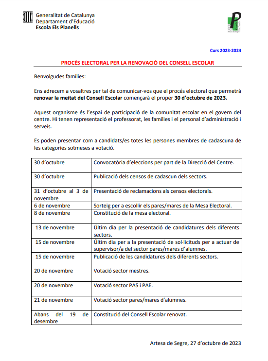 - Presentar-vos com a candidats o candidates per representar les famílies al consell escolar.