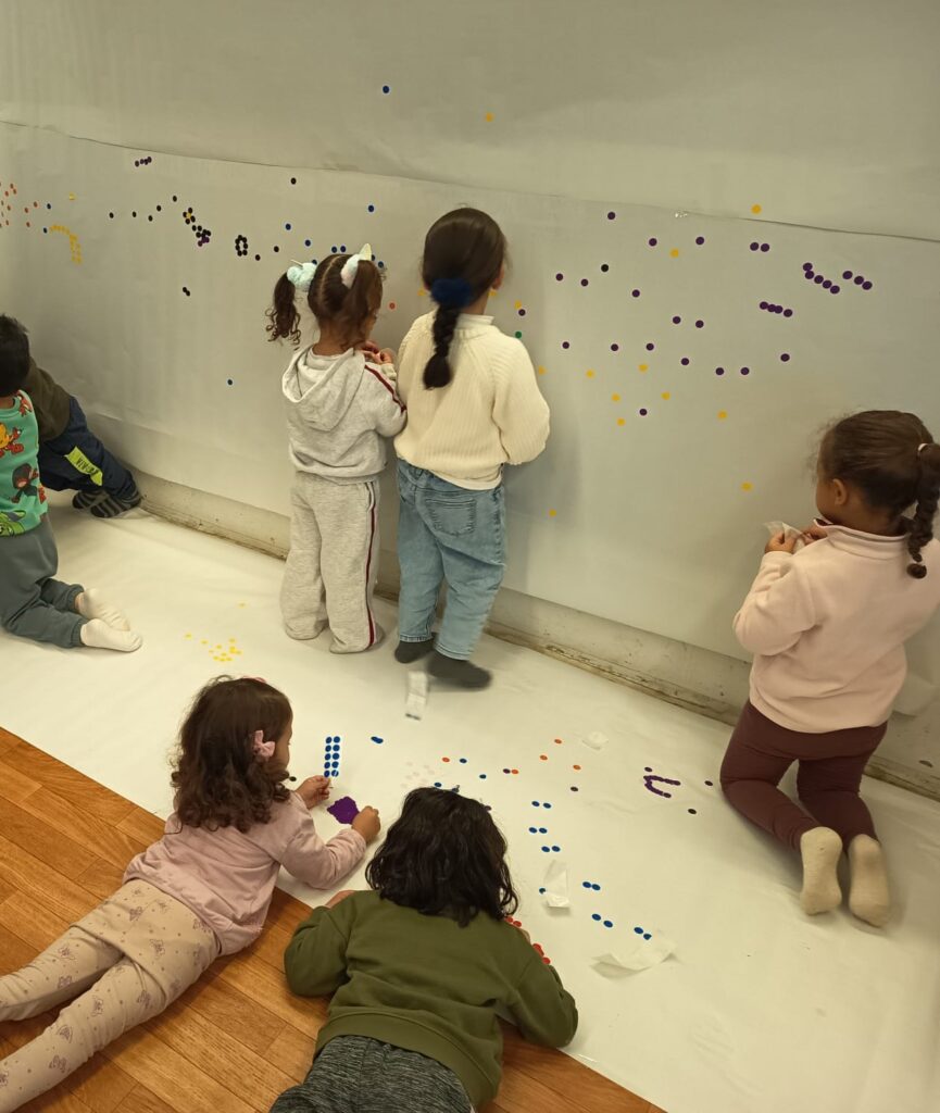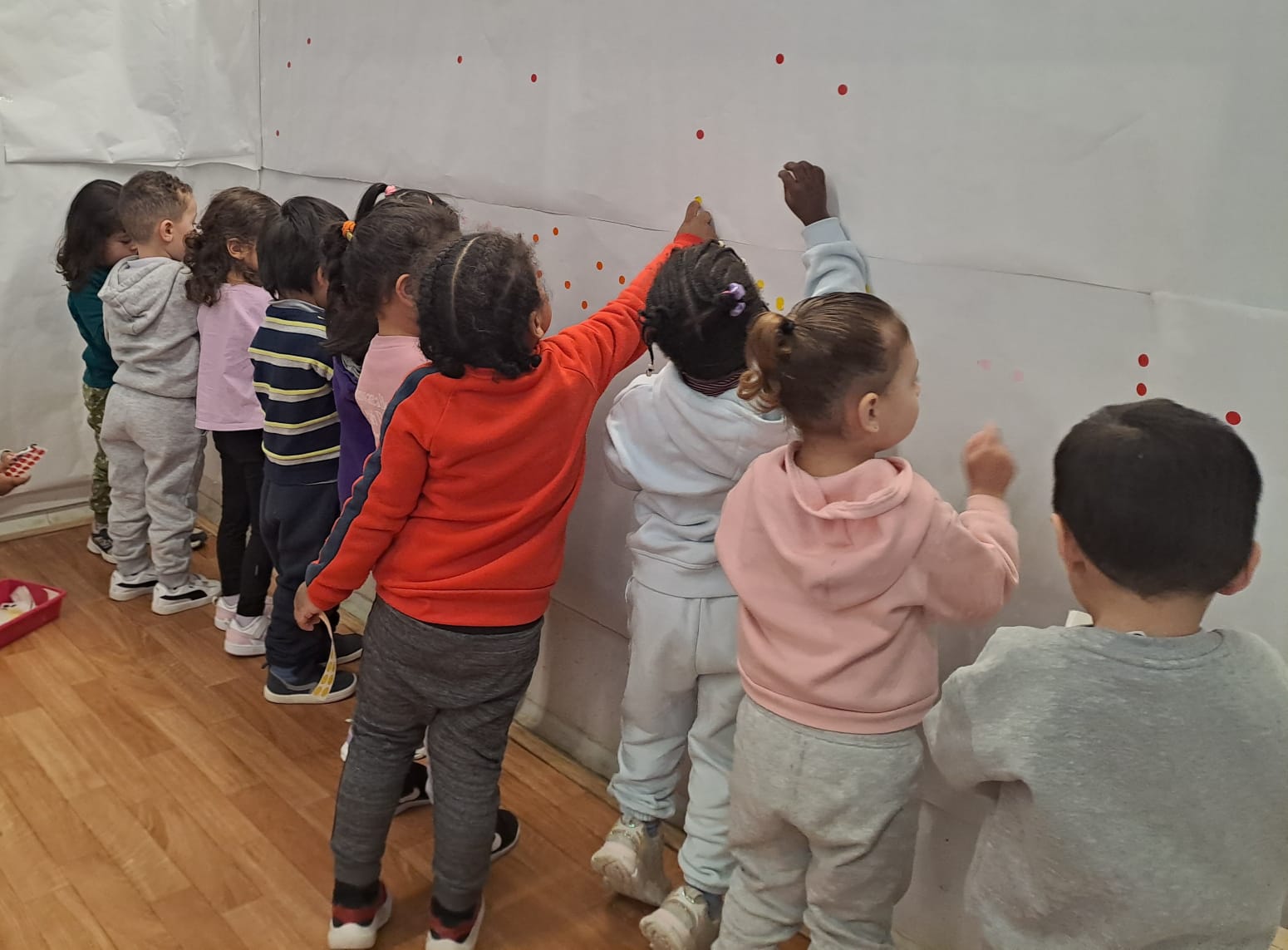 Per apropar-nos a la seva obra, hem treballat a partir de propostes manipulatives i vivencials. Hem experimentat lliurement amb la pintura utilitzant diferents materials per crear punts: taps de suro, gomets, dits i bastonets. Ens ha encantat omplir els espais amb cercles de tots colors, grans i petits, tot jugant amb la repetició, tal com feia l’artista.