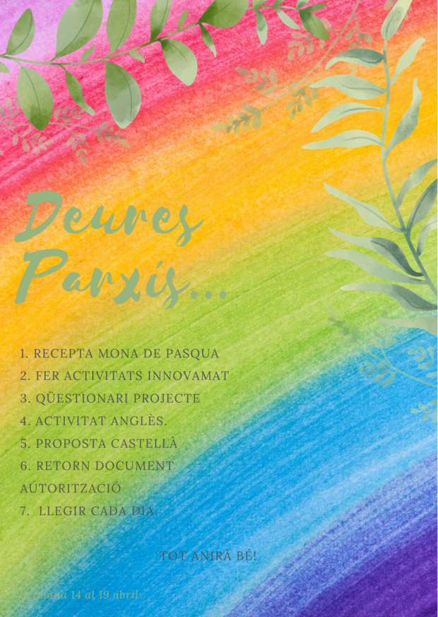Per tal de poder aprofitar aquests dies de confinament i no perdre massa el fil, us proposem aquest seguit de recomanacions. Aclarir-vos que, en cap cas, són feines avaluables, és a dir, no les utilitzarem per posar notes. Aneu fent, una estoneta cada dia, amb calma. Nosaltres estem pendents de les indicacions del departament i anireu rebent notícies setmanalment.