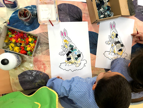 Estem coneixent els seus contes i reproduint els seus personatges amb les tècniques de la pintura i el collage.