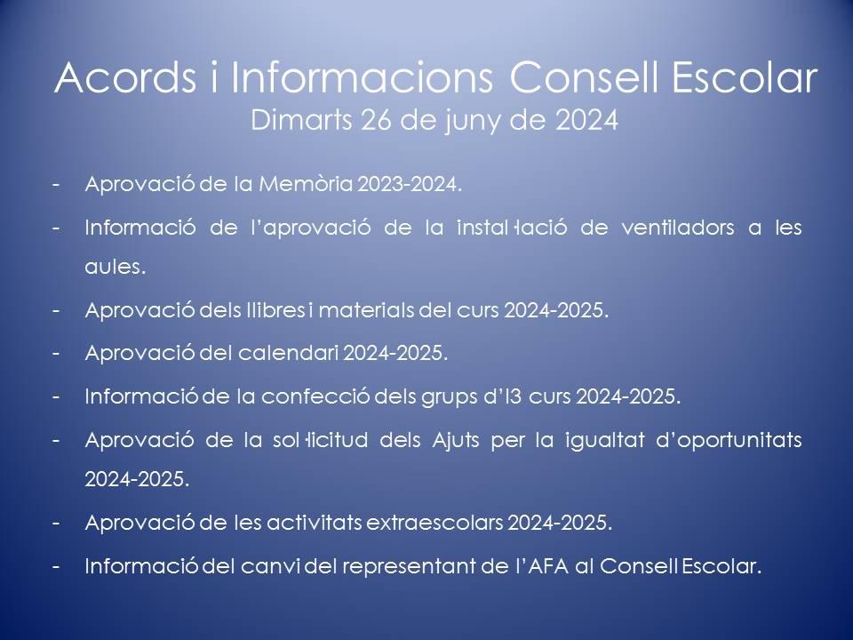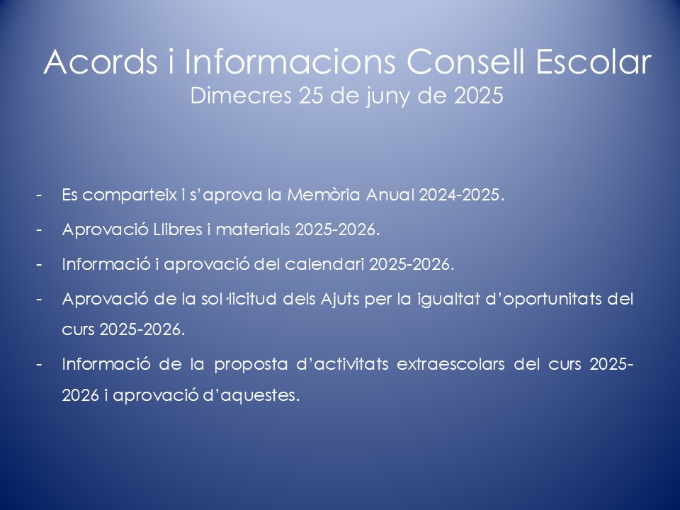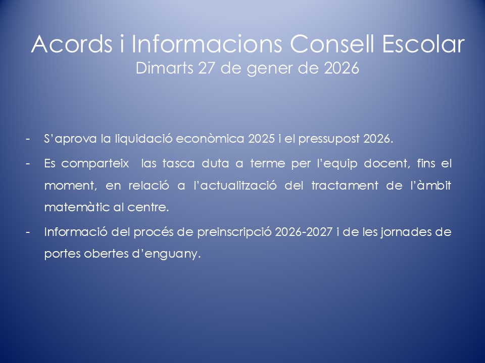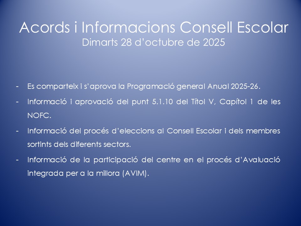 El Consell Escolar és l’òrgan col·legiat de participació de la Comunitat Escolar i de govern del centre. En el Consell Escolar hi ha representants de tots els col·lectius que intervenen en la comunitat educativa: Direcció, mestres, famílies, personal d’administració i serveis, etc.