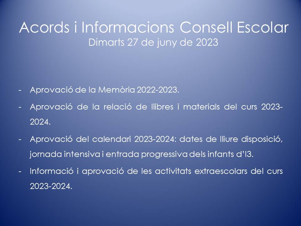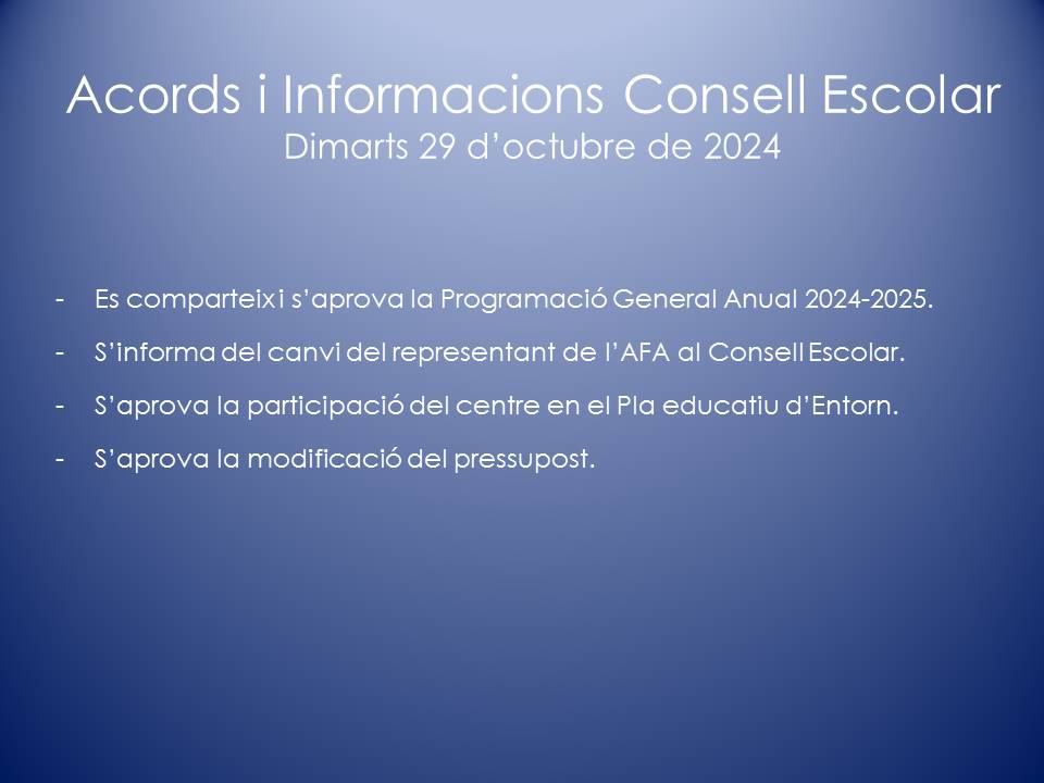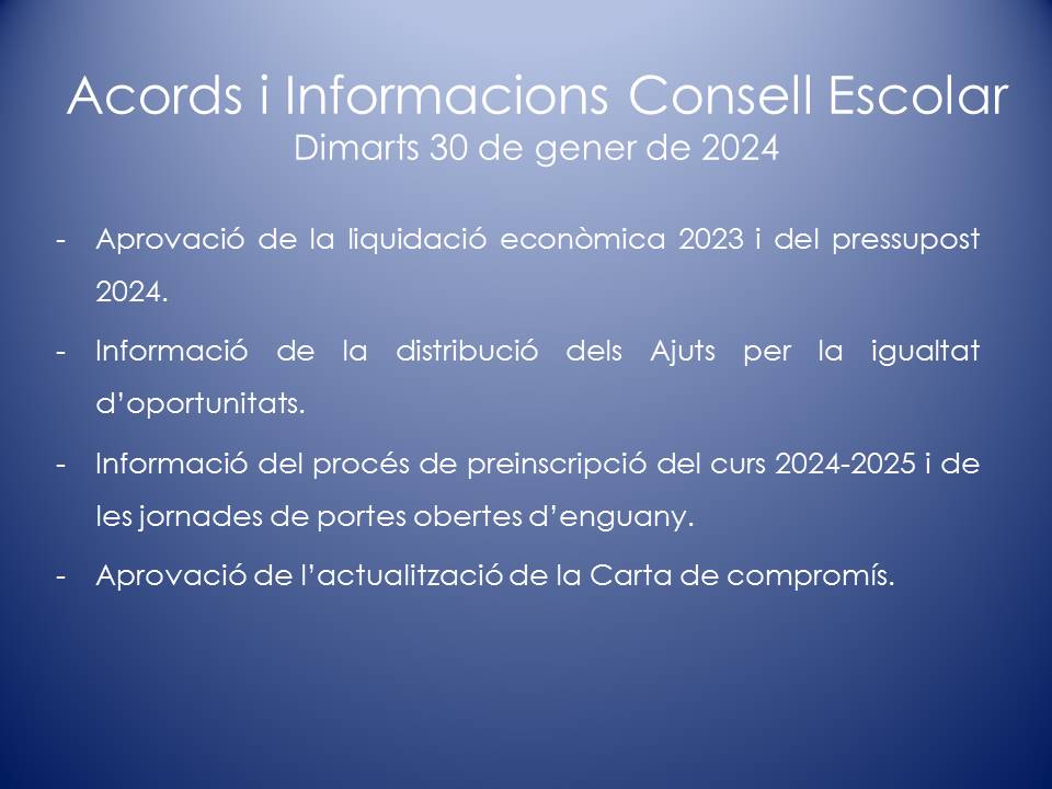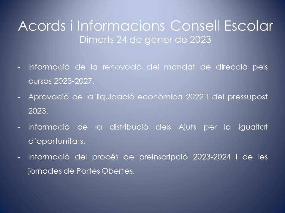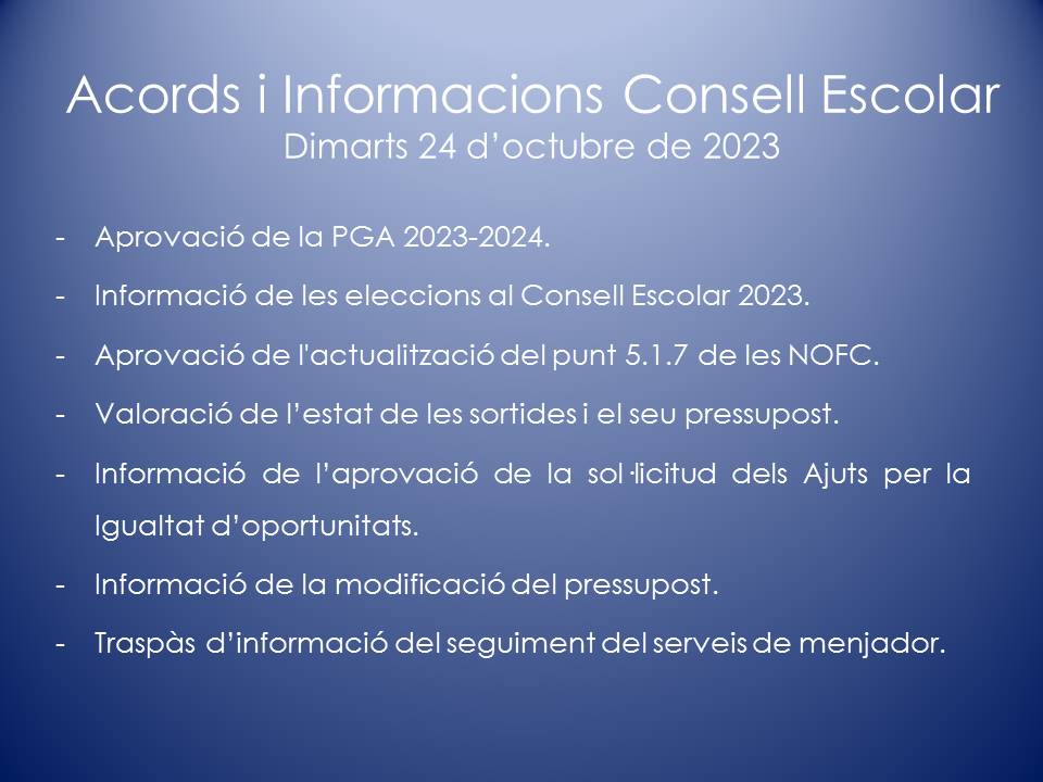 El Consell Escolar és l’òrgan col·legiat de participació de la Comunitat Escolar i de govern del centre. En el Consell Escolar hi ha representants de tots els col·lectius que intervenen en la comunitat educativa: Direcció, mestres, famílies, personal d’administració i serveis, etc.
