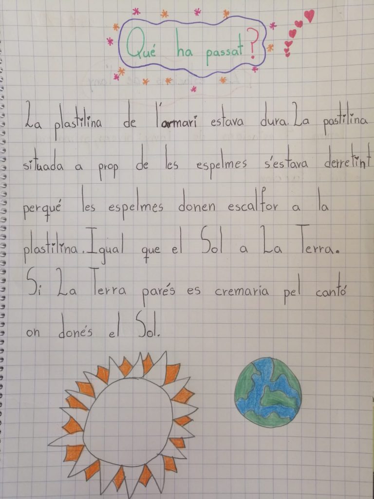La classe de La Lliga de la justícia estem fent un projecte de ciències naturals. Ens preguntem què passaria si la Terra deixés de girar i, per esbrinar-ho, hem fet un seguit d’investigacions. En una d’aquestes vam fer un experiment. Vam col.locar dues espelmes enceses al costat d’un troç de plastilina i dues d’apagades amb un altre troç. Això és el què va passar: