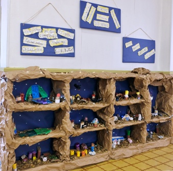 A l’edifici dels grans, cada any fem un pessebre conjunt elaborant els diferents personatges i objectes amb materials de rebuig. L’any passat van ser tetra bricks, l’anterior pots de iogurt i enguany hem aprofitat tubs de paper higiènic. A partir d’una llista amb les figures i elements que pot tenir un pessebre, l’alumnat de 3r, 4t, 5è i 6è vam repartir-nos la feina. Primer vam dibuixar un croquis, vam fer llistat del material necessari i després vam posar fil a l’agula. Amb la imaginació i habilitat de tots els nens i nenes de l’edifici vam aconseguir un pessebre ben original, no trobeu?
