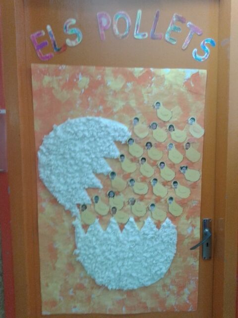 Hem començat a decorar la porta de la nostra classe. Fem boletes blanques i omplim un ou trencat gegant, pintem pollets de color groc i estampem el fons!!!
