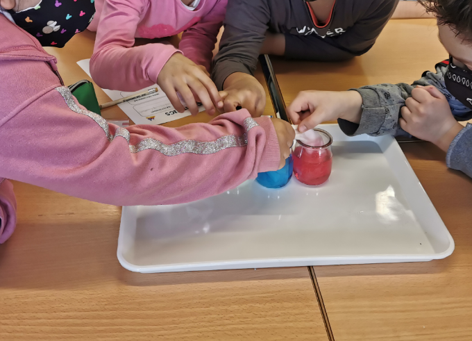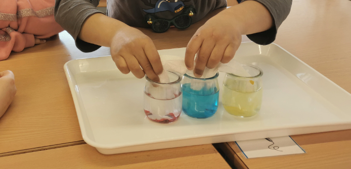 4. EXPERIMENT DEL COLORANT: Què passa quan posem colorant a l’aigua i un paper d’un pot a un altre? Doncs que veiem com passa el color al paper! Així ens contagiem, amb el contacte!