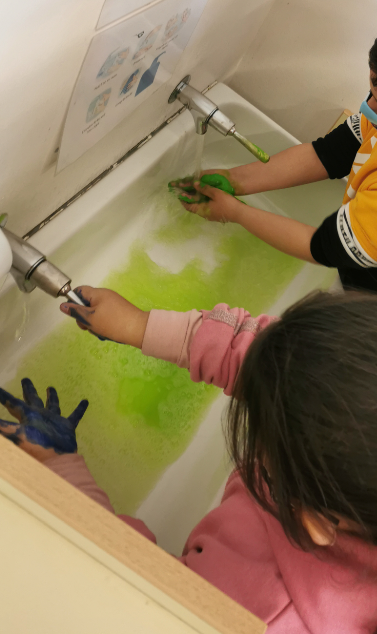 2. EXPERIMENT AMB PINTURA: Què passa si ens rentem la pintura amb aigua? Necessitem sabó! Molt important, perquè així marxen tots els bacteris!