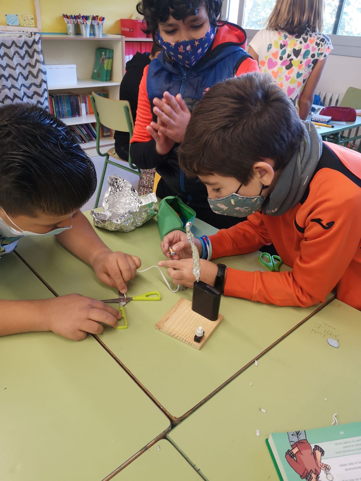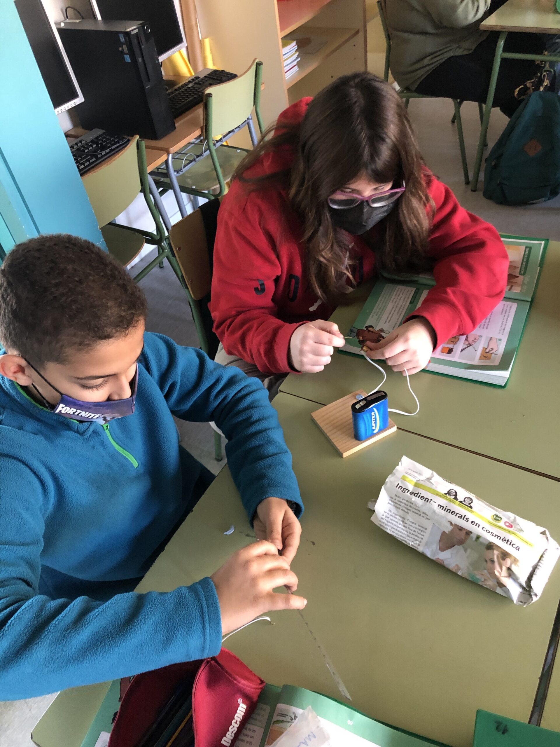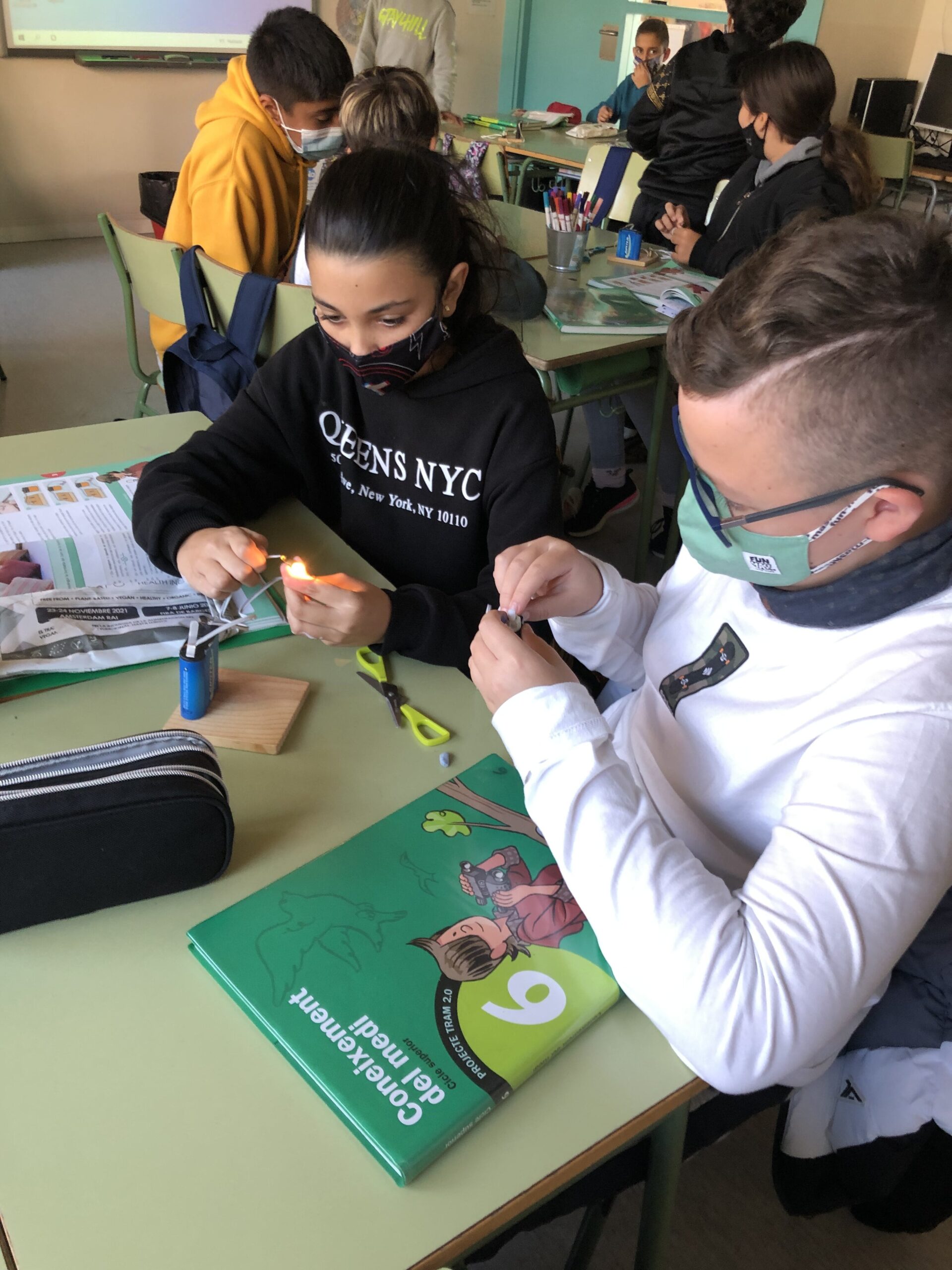 Ho vam fer tot en parelles i un cop vam aconseguir que la bombeta funcionés, vam treure l’interruptor i vam estar provant amb uns altres materials per veure si eren conductors de l’electricitat. Per exemple: amb les tisores funcionava, però amb el regle no.