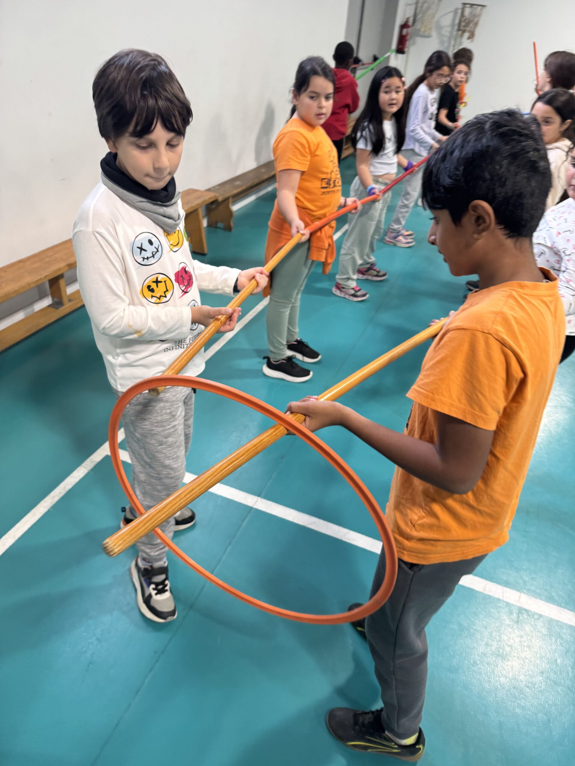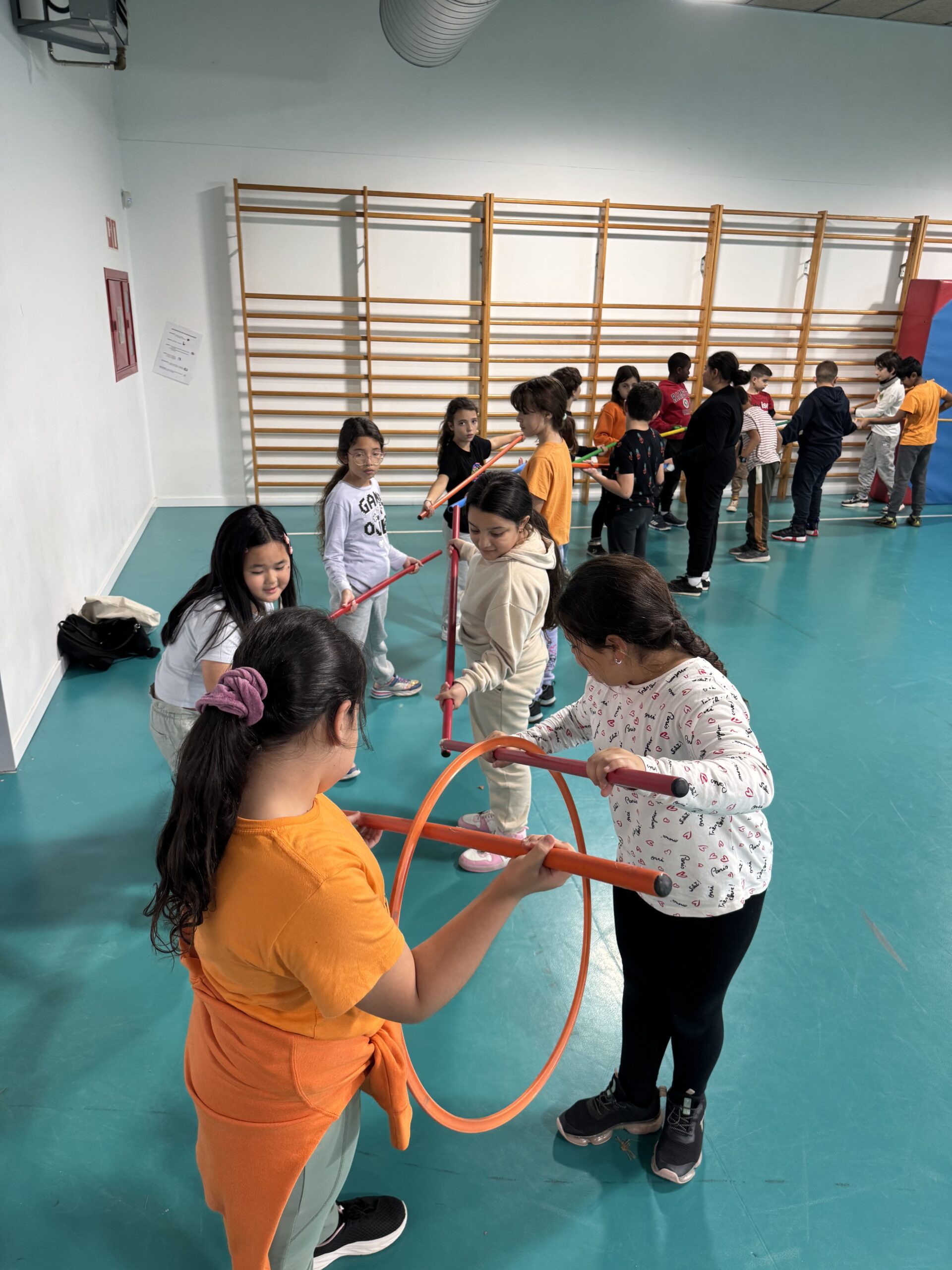 Fa unes setmanes a educació física vam treballar els jocs cooperatius, en aquest cas l’alumnat està fent la dinàmica de les vies del tren on tots junts/es amb les piques formen la via i el cercle o la pilota ha d’anar rodant i avançant per aquestes.