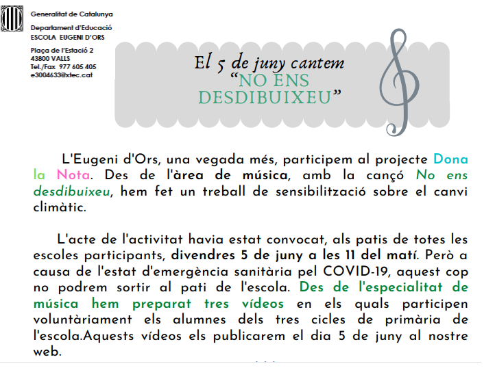 Per fi ha arribat el dia! Des de l’àrea de música volem compartir una petita representació del treball fet pels alumnes de primària per participar en el projecte” Encara hi som a temps”. E N H O R A B O N A !? A continuació trobareu: Els vídeos creats per a la nostra participació, l’enllaç